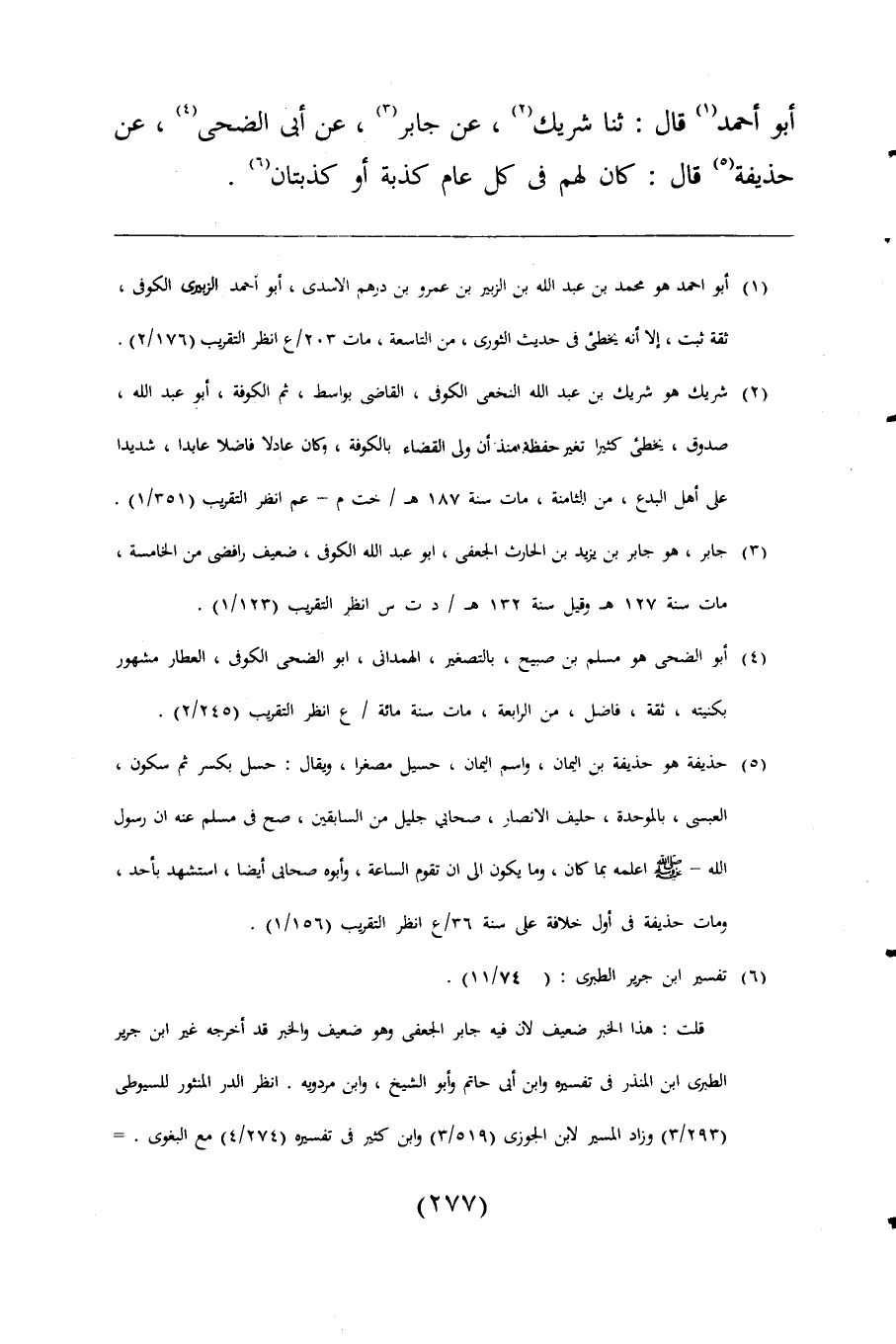 (¬2) شريك هو شريك بن عبد اللَّه النخعى الكوفى، القاضى بواسط، ثم الكوفة، أبو عبد اللَّه، صدوق، يخطئ كثيرا تغير حفظه منذ أن ولى القضاء بالكوفة، وكان عادلا فاضلا عابدا، شديدا على أهل البدع، من الثامنة، مات سنة 187 هـ / خت م - عم انظر التقريب (351/ 1).