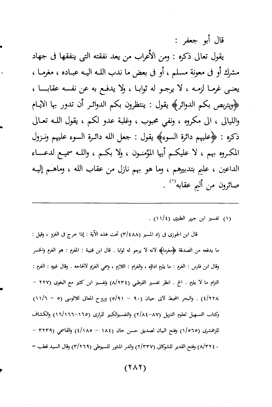 يقول تعالى ذكره: ومن الأعراب من يعد نفقته التى ينفقها فى جهاد مشرك أو فى معونة مسلم، أو فى بعض ما ندب اللَّه إليه عباده، مغرما، يعنى غرما لزمه، لا يرجو له ثوابا، ولا يدفع به عن نفسه عقابا، {وَيَتَرَبَّصُ بِكُمُ الدَّوَائِرَ} يقول: ينتظرون بكم الدوائر أن تدور بها الأيام والليالى، الى مكروه، ونفي محبوب، وغلبة عدو لكم، يقول اللَّه تعالى ذكره: {عَلَيْهِمْ دَائِرَةُ السَّوْءِ} يقول: جعل اللَّه دائرة السوء عليهم ونزول المكروه بهم، لا عليكم أيها المؤمنون، ولا بكم، واللَّه سميع لدعاء الداعين، عليم بتدبيرهم، وما هو بهم نازل من عقاب اللَّه، وما هم إليه صائرون من أليم عقابه (¬1).