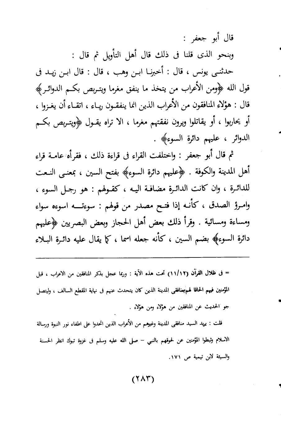 ثم قال أبو جعفر: واختلفت القراء فى قراءة ذلك، فقرأه عامة قراء أهل المدينة والكوفة. {عَلَيْهِمْ دَائِرَةُ السَّوْءِ} بفتح السين، بمعنى النعت للدائرة، وإن كانت الدائرة مضافة إليه، كقولهم: هو رجل السوء، وامرؤ الصدق، كأنه إذا فتح مصدر من قولهم: سوءته أسوءه سواء ومساءة ومسائية. وقرأ ذلك بعض أهل الحجاز وبعض البصريين {عَلَيْهِمْ دَائِرَةُ السَّوْءِ} بضم السين، كأنه جعله اسما، كما يقال عليه دائرة البلاء