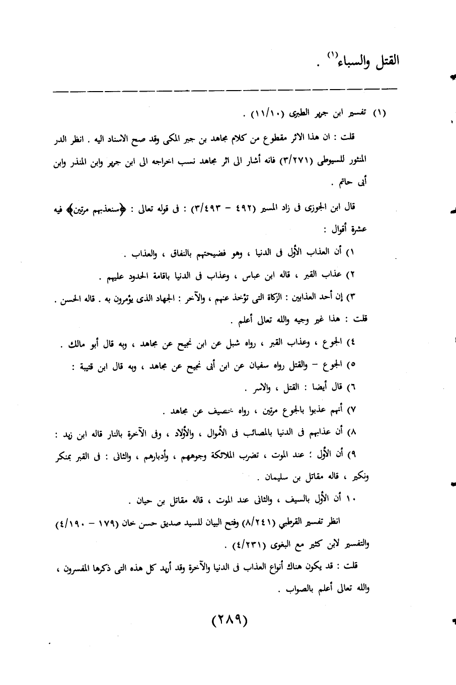 قال ابن الجوزى فى زاد المسير (492 - 493/ 3): فى قوله تعالى: {سَنُعَذِّبُهُمْ مَرَّتَيْنِ} فيه عشرة أقوال: