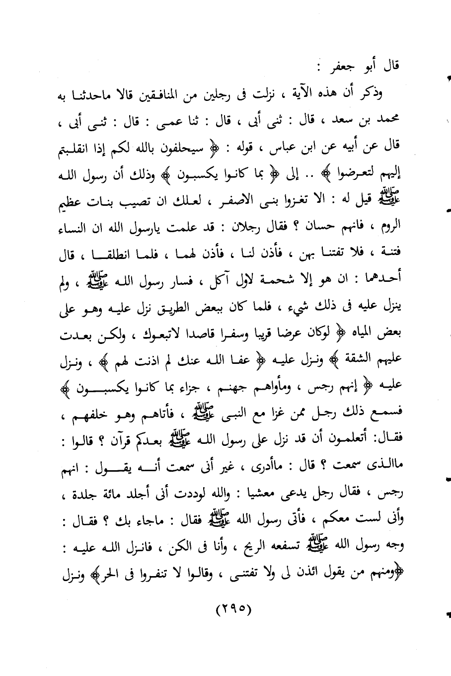 وذكر أن هذه الآية، نزلت فى رجلين من المنافقين قالا ما حدثنا به محمد بن سعد، قال: ثنى أبى، قال: ثنا عمى: قال: ثنى أبى، قال عن أبيه عن ابن عباس، قوله: {سَيَحْلِفُونَ بِاللَّهِ لَكُمْ إِذَا انْقَلَبْتُمْ إِلَيْهِمْ لِتُعْرِضُوا} .. الى {بِمَا كَانُوا يَكْسِبُونَ} وذلك أن رسول اللَّه -صلى اللَّه عليه وسلم- قيل له: ألا تغزوا بنى الأصفر، لعلك أن تصيب بنات عظيم الروم، فإنهم حسان؟ فقال رجلان: قد علمت يا رسول اللَّه أن النساء فتنة، فلا تفتنا بهن، فأذن لنا، فأذن لهما، فلما انطلقا، قال أحدهما: إن هو إلا شحمة لأول آكل، فسار رسول اللَّه -صلى اللَّه عليه وسلم-، ولم ينزل عليه فى ذلك شيء، فلما كان ببعض الطريق نزل عليه وهو على بعض المياه {لَوْ كَانَ عَرَضًا قَرِيبًا وَسَفَرًا قَاصِدًا لَاتَّبَعُوكَ وَلَكِنْ بَعُدَتْ عَلَيْهِمُ الشُّقَّةُ} ونزل عليه {عَفَا اللَّهُ عَنْكَ لِمَ أَذِنْتَ لَهُمْ}، ونزل عليه {إِنَّهُمْ رِجْسٌ وَمَأْوَاهُمْ جَهَنَّمُ جَزَاءً بِمَا كَانُوا يَكْسِبُونَ} فسمع ذلك رجل ممن غزا مع النبي -صلى اللَّه عليه وسلم-، فأتاهم وهو خلفهم، فقال: أتعلمون أن قد نزل على رسول اللَّه -صلى اللَّه عليه وسلم- بعدكم قرآن؟ قالوا: ما الذى سمعت؟ قال: ما أدرى، غير أنى سمعت أنه يقول: إنهم رجس، فقال رجل يدعى معشيا: واللَّه لوددت أنى أجلد مائة جلدة، وأنى لست معكم، فأتى رسول اللَّه -صلى اللَّه عليه وسلم- فقال: ما جاء بك؟ فقال: وجه رسول اللَّه -صلى اللَّه عليه وسلم- تسفعه الريح، وأنا فى الكن، فأنزل اللَّه عليه: {وَمِنْهُمْ مَنْ يَقُولُ ائْذَنْ لِي وَلَا تَفْتِنِّي}، {وَقَالُوا لَا تَنْفِرُوا فِي الْحَرِّ} ونزل