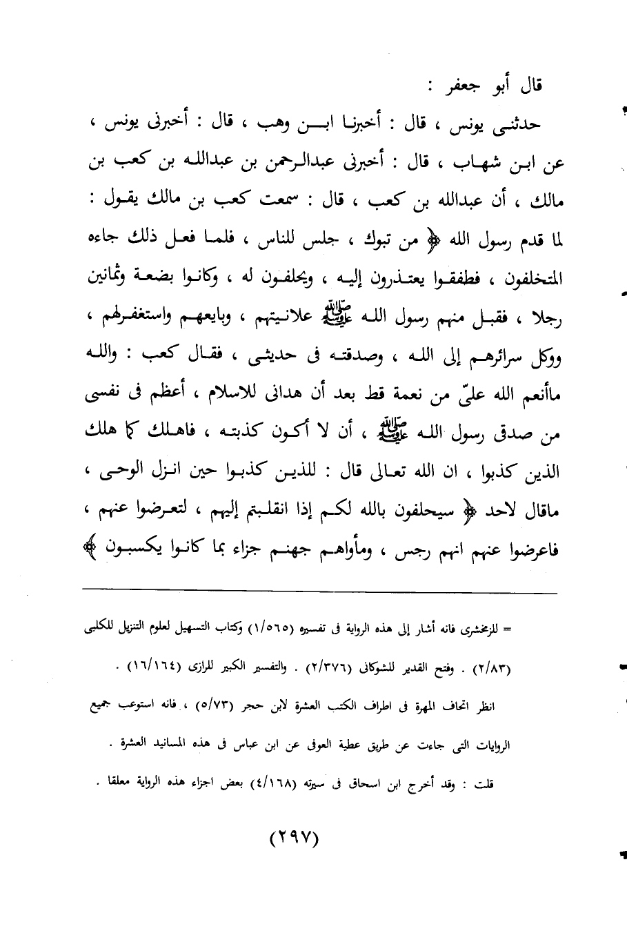 حدثنى يونس، قال: أخبرنا ابن وهب، قال: أخبرنى يونس، عن ابن شهاب، قال: أخبرنى عبد الرحمن بن عبد اللَّه بن كعب بن مالك، أن عبد اللَّه بن كعب، قال: سمعت كعب بن مالك يقول: لما قدم رسول اللَّه من تبوك، جلس للناس، فلما فعل ذلك جاءه المتخلفون، فطفقوا يعتذرون إليه، ويحلفون له، وكانوا بضعة وثمانين رجلا، فقبل منهم رسول اللَّه -صلى اللَّه عليه وسلم- علانيتهم، وبايعهم واستغفر لهم، ووكل سرائرهم الى اللَّه، وصدقت فى حديثى، فقال كعب: واللَّه ما أنعم اللَّه عليّ من نعمة قط بعد أن هدانى للإسلام، أعظم فى نفسى من صدقى رسول اللَّه -صلى اللَّه عليه وسلم-، أن لا أكون كذبته، فأهلك كما هلك الذين كذبوا، إن اللَّه تعالى قال: للذين كذبوا حين أنزل الوحى، ما قال لأحد {سَيَحْلِفُونَ بِاللَّهِ لَكُمْ إِذَا انْقَلَبْتُمْ إِلَيْهِمْ لِتُعْرِضُوا عَنْهُمْ فَأَعْرِضُوا عَنْهُمْ إِنَّهُمْ رِجْسٌ وَمَأْوَاهُمْ جَهَنَّمُ جَزَاءً بِمَا كَانُوا يَكْسِبُونَ}
