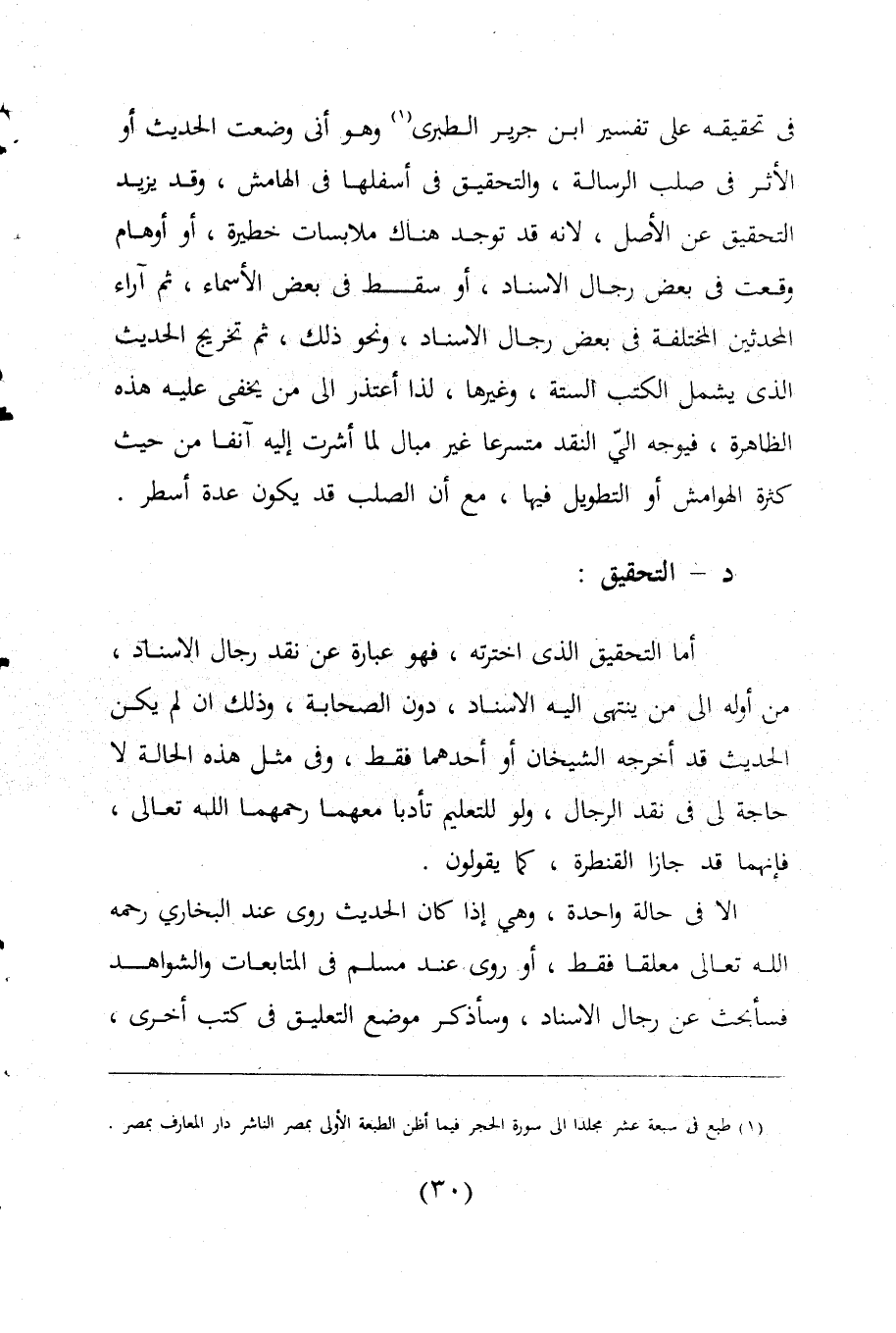 فى تحقيقه على تفسير ابن جرير الطبرى (¬1) وهو أنى وضعت الحديث أو الأثر فى صلب الرسالة، والتحقيق فى أسفلها فى الهامش، وقد يزيد التحقيق عن الأصل، لانه قد توجد هناك ملابسات خطيرة، أو أوهام وقعت فى بعض رجال الاسناد، أو سقط فى بعض الأسماء، ثم آراء المحدثين المختلفة فى بعض رجال الاسناد، ونحو ذلك، ثم تخرج الحديث الذى يشمل الكتب الستة، وغيرها، لذا أعتذر الى من يخفى عليه هذه الظاهرة، فيوجه الى النقد متسرعا غير مبال لما أشرت إليه آنفا من حيث كثرة الهوامش أو التطويل فيها، مع أن الصلب قد يكون عدة أسطر.