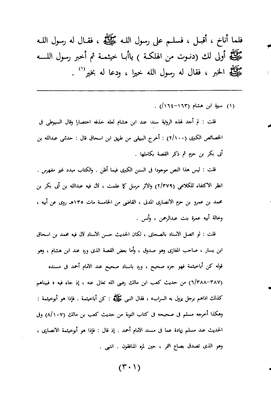 قلت: لو اتصل الاسناد بالصحابى، لكان الحديث حسن الاسناد لان فيه محمد بن اسحاق ابن يسار، صاحب المغازى وهو صدوق، وأما بعض القصة الذى ورد عند ابن هشام، وهو قوله كن أبا خيثمة فهو جزء صحيح، ورد باسناد صحيح عند الإمام أحمد فى مسنده (378 - 388/ 6) من حديث كعب ابن مالك رضي اللَّه تعالى عنه، إذ جاء فيه "فبيناهم كذلك اذا هم برجل يزول به السراب"، فقال النبي -صلى اللَّه عليه وسلم-: كن أبا خيثمة. فإذا هو أبو خيثمة: وهكذا أخرجه مسلم فى صحيحه فى كتاب التوبة من حديث كعب بن مالك (107/ 8) وفى الحديث عند مسلم زيادة عما فى مسند الإمام أحمد. إذ قال: فإذا هو أبو خيثمة الأنصارى، وهو الذى تصدق بصاع التمر، حين لمزه المنافقون. انتهى.