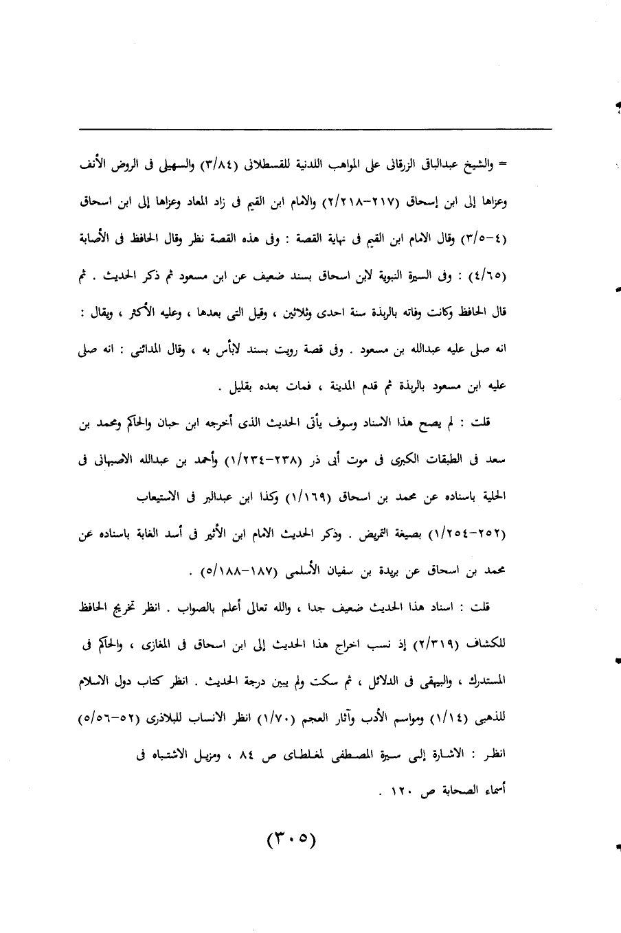 = والشيخ عبد الباقى الزرقانى على المواهب اللدنية للقسطلانى (84/ 3) والسهيلى فى الروض الأنف وعزاها الى ابن إسحاق (217 - 218/ 2) والامام ابن القيم فى زاد المعاد وعزاها الى ابن اسحاق (4 - 5/ 3) وقال الإمام ابن القيم فى نهاية القصة: وفى هذه القصة نظر وقال الحافظ فى الإصابة (65/ 4): وفى السيرة النبوية لابن إسحاق بسند ضعيف عن ابن مسعود ثم ذكر الحديث. ثم قال الحافظ وكانت وفاته بالربذة سنة احدى وثلاثين، وقيل التى بعدها، وعليه الأكثر، ويقال: أنه صلى عليه عبد اللَّه بن مسعود. وفى قصة رويت بسند لا بأس به، وقال المدائنى: أنه صلى عليه ابن مسعود بالربذة ثم قدم المدينة، فمات بعده بقليل.