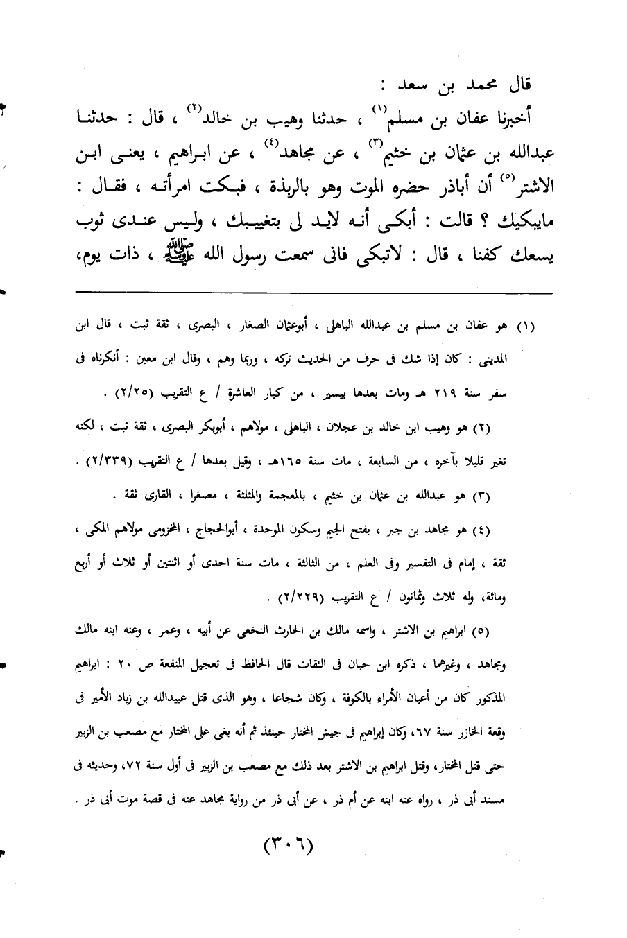 أخبرنا عفان بن مسلم (¬1)، حدثنا وهيب بن خالد (¬2)، قال: حدثنا عبد اللَّه بن عثمان بن خثيم (¬3)، عن مجاهد (¬4)، عن إبراهيم، يعنى ابن الاشتر (¬5) أن أبا ذر حضره الموت وهو بالربذة، فبكت امرأته، فقال: ما يبكيك؟ قالت: أبكى أنه لا يد لى بتغييبك، وليس عندى ثوب يسعك كفنا، قال: لا تبكى فانى سمعت رسول اللَّه -صلى اللَّه عليه وسلم-، ذات يوم،