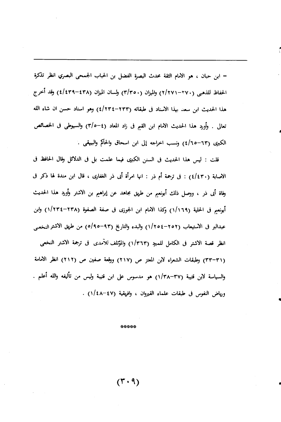 قلت: ليس هذا الحديث فى السنن الكبرى فيما علمت بل فى الدلائل وقال الحافظ فى الإصابة (430/ 4): فى ترجمة أم ذر: انها امرأة أبى ذر الغفارى، قال ابن مندة لها ذكر فى وفاة أبى ذر، ووصل ذلك أبو نعيم من طريق مجاهد عن إبراهيم بن الاشتر وأورد هذا الحديث أبو نعيم فى الحلية (169/ 1) وكذا الإمام ابن الجوزى فى صفة الصفوة (234 - 238/ 1) وابن عبد البر فى الاستيعاب (252 - 254/ 1) والبدء والتاريخ (93 - 95/ 5) من طريق الاشتر النخعي انظر قصة الاشتر فى الكامل للمبرد (363/ 1) والمؤتلف للآمدى فى ترجمة الاشتر النخعي (31 - 33) وطبقات الشعراء لابن المعتز ص (217) ووقعة صفين ص (212) انظر الامامة والسياسة لابن قتيبة (37 - 38/ 1) هو مدسوس على ابن قتيبة وليس من تأليفه واللَّه أعلم. ورياض النفوس فى طبقات علماء القيروان، وافريقية (47 - 48/ 1).