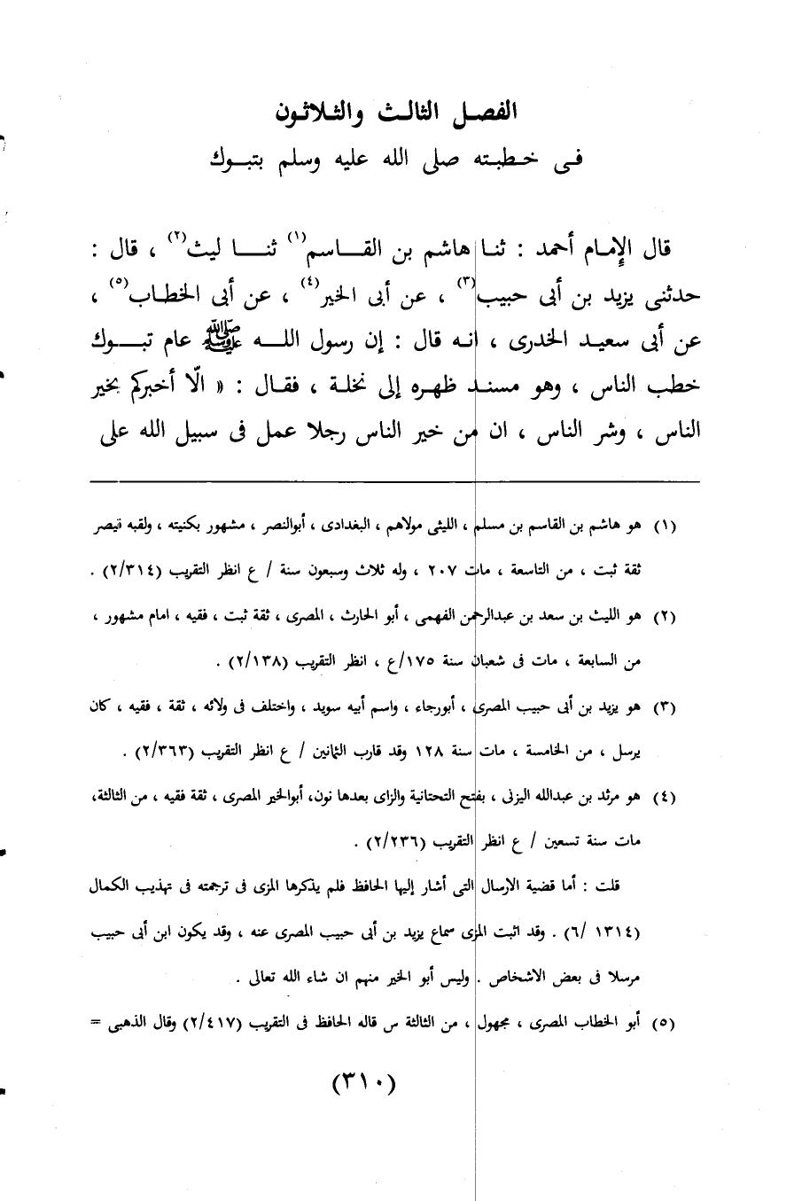 قال الإِمام أحمد: ثنا هاشم بن القاسم (¬1) ثنا ليث (¬2)، قال: حدثنى يزيد بن أبى حبيب (¬3)، عن أبى الخير (¬4)، عن أبى الخطاب (¬5)، عن أبى سعيد الخدرى، انه قال: إن رسول اللَّه -صلى اللَّه عليه وسلم- عام تبوك خطب الناس، وهو مسند ظهره الى نخلة، فقال: "الّا أخبركم بخير الناس، وشر الناس، ان من خير الناس رجلا عمل فى سبيل اللَّه على