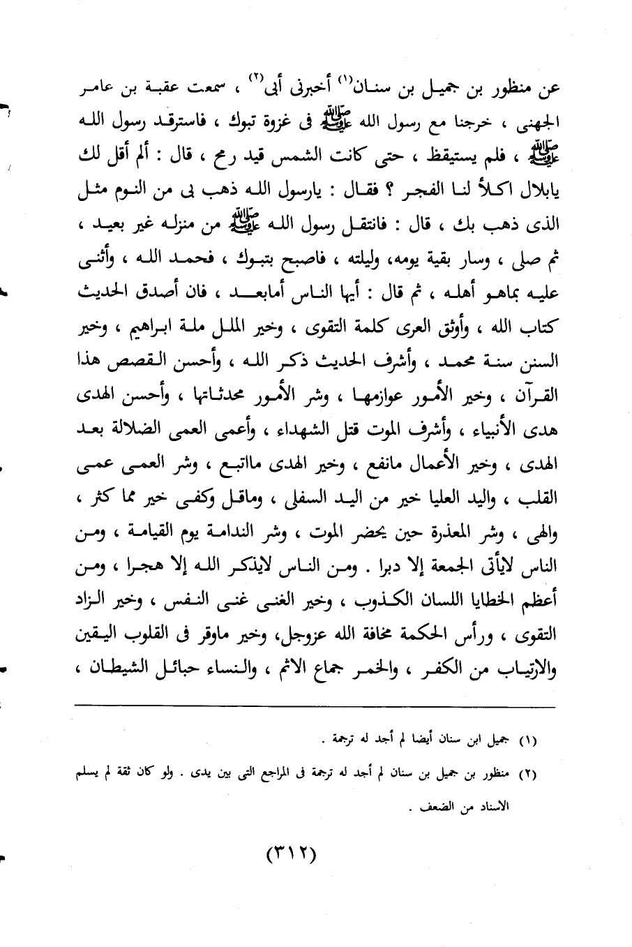 عن منظور بن جميل بن سنان (¬1) أخبرنى أبى (¬2)، سمعت عقبة بن عامر الجهنى، خرجنا مع رسول اللَّه -صلى اللَّه عليه وسلم- فى غزوة تبوك، فاسترقد رسول اللَّه -صلى اللَّه عليه وسلم-، فلم يستيقظ، حتى كانت الشمس قيد رمح، قال: ألم أقل لك يا بلال اكلأ لنا الفجر؟ فقال: يا رسول اللَّه ذهب بى من النوم مثل الذى ذهب بك، قال: فانتقل رسول اللَّه -صلى اللَّه عليه وسلم- من منزله غير بعيد، ثم صلى، وسار بقية يومه، وليلته، فاصبح بتبوك، فحمد اللَّه، وأثنى عليه بما هو أهله، ثم قال: أيها الناس أما بعد، فان أصدق الحديث كتاب اللَّه، وأوثق العرى كلمة التقوى، وخير الملل ملة إبراهيم، وخير السنن سنة محمد، وأشرف الحديث ذكر اللَّه، وأحسن القصص هذا القرآن، وخير الأمور عوازمها، وشر الأمور محدثاتها، وأحسن الهدى هدى الأنبياء، وأشرف الموت قتل الشهداء، وأعمى العمى الضلالة بعد الهدى، وخير الأعمال ما نفع، وخير الهدى ما اتبع، وشر العمى عمى القلب، واليد العليا خير من اليد السفلى، وما قل وكفى خير مما كثر، والهى، وشر المعذرة حين يحضر الموت، وشر الندامة يوم القيامة، ومن الناس لا يأتى الجمعة إلا دبرا. ومن الناس لا يذكر اللَّه إلا هجرا، ومن أعظم الخطايا اللسان الكذوب، وخير الغنى غنى النفس، وخير الزاد التقوى، ورأس الحكمة مخافة اللَّه عز وجل، وخير ما وقر فى القلوب اليقين والارتياب من الكفر، والخمر جماع الاثم، والنساء حبائل الشيطان،