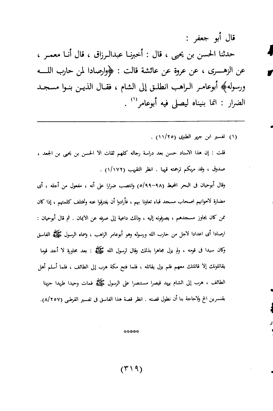 حدثنا الحسن بن يحيى، قال: أخبرنا عبد الرزاق، قال أنا معمر، عن الزهري، عن عروة عن عائشة قالت: {وَإِرْصَادًا لِمَنْ حَارَبَ اللَّهَ وَرَسُولَهُ} أبو عامر الراهب انطلق الى الشام، فقال الذين بنوا مسجد الضرار: انما بنيناه ليصلى فيه أبو عامر (¬1).