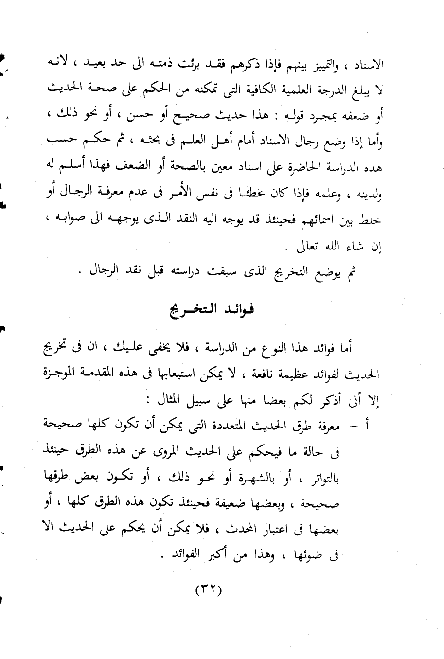 الاسناد، والتمييز بينهم فإذا ذكرهم فقد بزلت ذمته الى حد بعيد، لانه لا يبلغ الدرجة العلمية الكافية التى تمكنه من الحكم على صحة الحديث أو ضعفه بمجرد قوله: هذا حديث صحيح أو حسن، أو نحو ذلك، وأما إذا وضع رجال الاسناد أمام أهل العلم فى بحثه، ثم حكم حسب هذه الدراسة الحاضرة على اسناد معين بالصحة أو الضعف فهذا أسلم له ولدينه، وعلمه فإذا كان مخطئا فى نفس الأمر فى عدم معرفة الرجال أو خلط بين اسمائهم فحينئذ قد يوجه اليه النقد الذى يوجهه الى صوابه، إن شاء اللَّه تعالى.