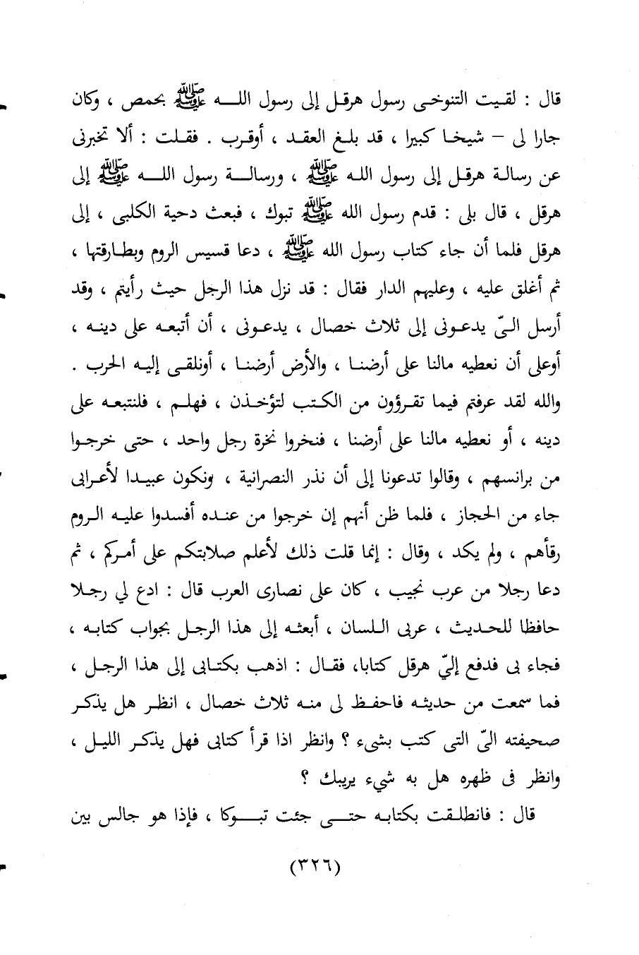 قال: لقيت التنوخى رسول هرقل الى رسول اللَّه -صلى اللَّه عليه وسلم- بحمص، وكان جارا لى -شيخا كبيرا، قد بلغ العقد، أو قرب. فقلت: ألا تخبرني عن رسالة هرقل الى رسول اللَّه -صلى اللَّه عليه وسلم-، ورسالة رسول اللَّه -صلى اللَّه عليه وسلم- الى هرقل، قال بلى: قدم رسول اللَّه -صلى اللَّه عليه وسلم- تبوك، فبعث دحية الكلبى، الى هرقل فلما أن جاء كتاب رسول اللَّه -صلى اللَّه عليه وسلم-، دعا قسيس الروم وبطارقتها، ثم أغلق عليه، وعليهم الدار فقال: قد نزل هذا الرجل حيث رأيتم، وقد أرسل إليَّ يدعوني الى ثلاث خصال، يدعوني، أن أتبعه على دينه، أو على أن نعطيه مالنا على أرضنا، والأرض أرضنا، أو نلقى إليه الحرب. واللَّه لقد عرفتم فيما تقرؤون من الكتب لتؤخذن، فهلم، فلنتبعه على دينه، أو نعطيه مالنا على أرضنا، فنخروا نخرة رجل واحد، حتى خرجوا من برانسهم، وقالوا تدعونا الى أن نذر النصرانية، ونكون عبيدا لأعرابي جاء من الحجاز، فلما ظن أنهم إن خرجوا من عنده أفسدوا عليه الروم رقأهم، ولم يكد، وقال: إنما قلت ذلك لأعلم صلابتكم على أمركم، ثم دعا رجلا من عرب نجيب، كان على نصارى العرب قال: ادع لي رجلا حافظا للحديث، عربي اللسان، أبعثه الى هذا الرجل بجواب كتابه، فجاء بى فدفع إليّ هرقل كتابا، فقال: اذهب بكتابي الى هذا الرجل، فما سمعت من حديثه فاحفظ لى منه ثلاث خصال، انظر هل يذكر صحيفته إليَّ التى كتب بشيء؟ وانظر اذا قرأ كتابي فهل يذكر الليل، وانظر فى ظهره هل به شيء يريبك؟