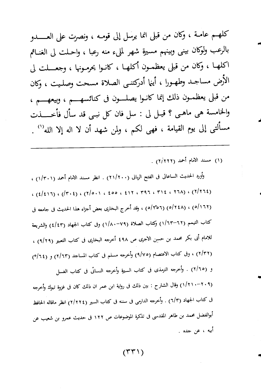 كلهم عامة، وكان من قبلى إنما يرسل الى قومه، ونصرت على العدو بالرعب ولو كان بينى وبينهم مسيرة شهر لملئ منه رعبا، واحلت لى الغنائم أكلها، وكان من قبلى يعظمون أكلها، كانوا يحرمونها، وجعلت لى الأرض مساجد وطهورا، أينما أدركتني الصلاة مسحت وصليت، وكان من قبلى يعظمون ذلك إنما كانوا يصلون فى كنائسهم، وبيعهم، والخامسة هي ما هى؟ قيل لى: سل فان كل نبى قد سأل فأخذت مسألتى الى يوم القيامة، فهي لكم، ولمن شهد أن لا اله إلا اللَّه (¬1).