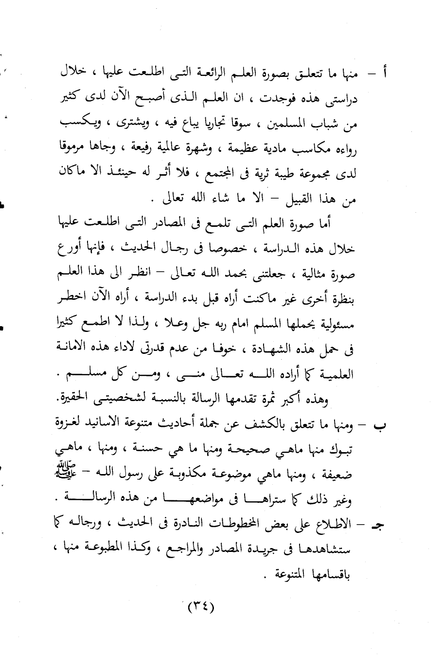 أ- منها ما تتعلق بصورة العلم الرائعة التى اطلعت عليها، خلال دراستى هذه فوجدت، ان العلم الذى أصبح الآن لدى كثير من شباب المسلمين، سوقا تجاريا يباع فيه، ويشترى، ويكسب رواءه مكاسب مادية عظيمة، وشهرة عالية رفيعة، وجاها مرموقا لدى مجموعة طيبة ثرية فى المجتمع، فلا أثر له حينئذ الا ما كان من هذا القبيل -الا ما شاء اللَّه تعالى.