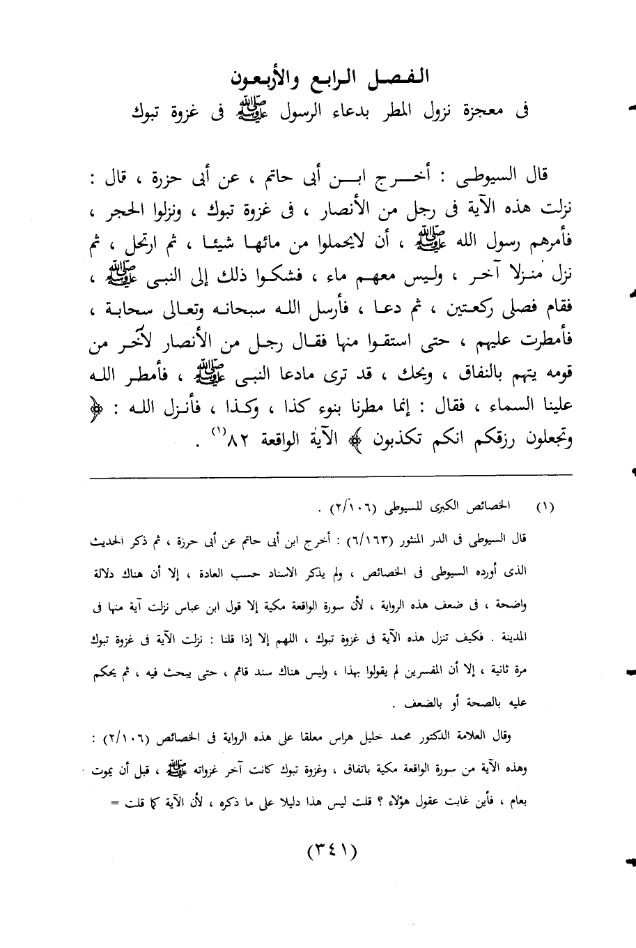 وقال العلامة الدكتور محمد خليل هراس معلقا على هذه الرواية فى الخصائص (106/ 2): وهذه الآية من سورة الواقعة مكية باتفاق، وغزوة تبوك كانت آخر غزواته -صلى اللَّه عليه وسلم-، قبل أن يموت بعام، فأين غابت عقول هؤلاء؟ قلت ليس هذا دليلا على ما ذكره، لأن الآية كما قلت =