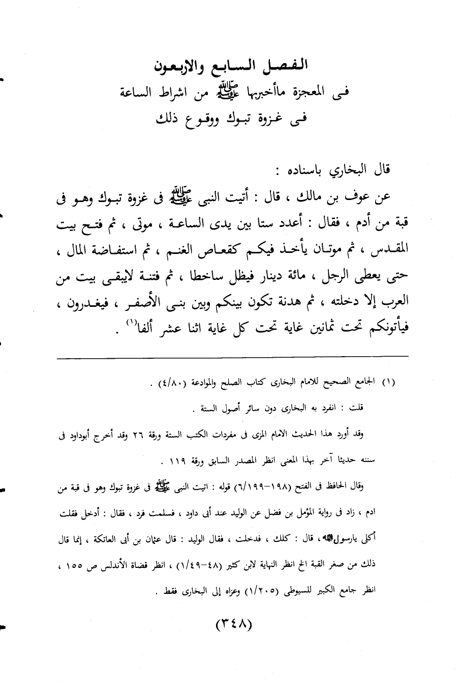 عن عوف بن مالك، قال: أتيت النبي -صلى اللَّه عليه وسلم- فى غزوة تبوك وهو فى قبة من أدم، فقال: أعدد ستا بين يدى الساعة، موتى، ثم فتح بيت المقدس، ثم موتان يأخذ فيكم كقعاص الغنم، ثم استفاضة المال، حتى يعطى الرجل، مائة دينار فيظل ساخطا، ثم فتنة لا يبقى بيت من العرب إلا دخلته، ثم هدنة تكون بينكم وبين بنى الأصفر، فيغدرون، فيأتونكم تحت ثمانين غاية تحت كل غاية اثنا عشر ألفا (¬1).