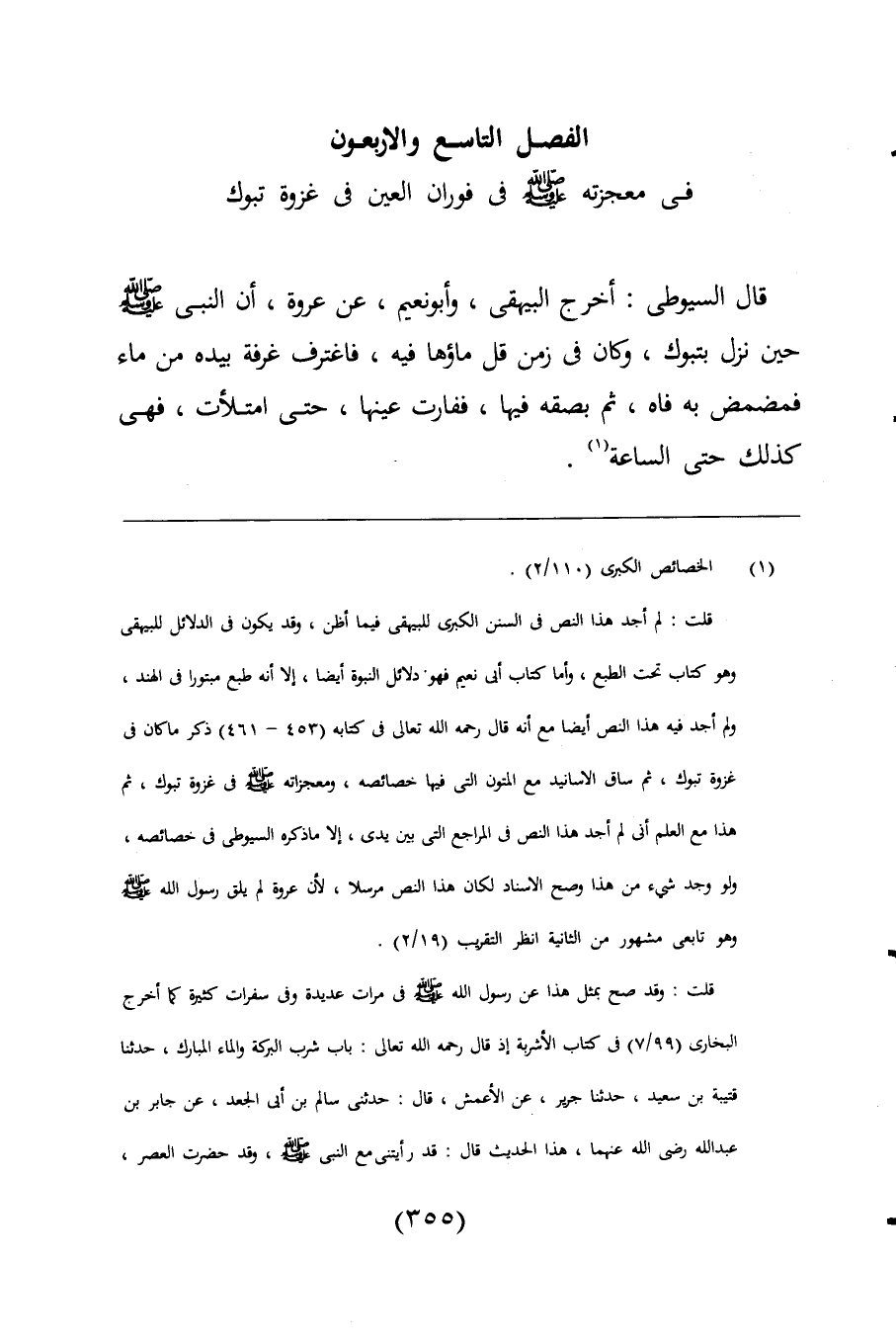 قلت: لم أجد هذا النص فى السنن الكبرى للبيهقى فيما أظن، وقد يكون فى الدلائل للبيهقي وهو كتاب تحت الطبع، وأما كتاب أبى نعيم فهو دلائل النبوة أيضًا، إلا أنه طبع مبتورا فى الهند، ولم أجد فيه هذا النص أيضًا مع أنه قال رحمه اللَّه تعالى فى كتابه (453 - 461) ذكر ما كان فى غزوة تبوك، ثم ساق الاسانيد مع المتون التى فيها خصائصه، ومعجزاته -صلى اللَّه عليه وسلم- فى غزوة تبوك، ثم هذا مع العلم أنى لم أجد هذا النص فى المراجع الى بين يدى، إلا ما ذكره السيوطى فى خصائصه، ولو وجد شئ من هذا وصح الاسناد لكان هذا النص مرسلا، لأن عروة لم يلق رسول اللَّه -صلى اللَّه عليه وسلم- وهو تابعى مشهور من الثانية انظر التقريب (19/ 2).