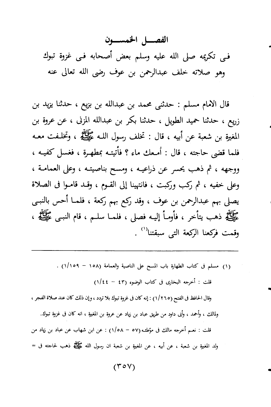 قال الإمام مسلم: حدثنى محمد بن عبد اللَّه بن بزيع، حدثنا يزيد بن زريع، حدثنا حميد الطويل، حدثنا بكر بن عبد اللَّه المزنى، عن عروة بن المغيرة بن شعبة عن أبيه، قال: تخلف رسول اللَّه -صلى اللَّه عليه وسلم-، وتخلفت معه فلما قضى حاجته، قال: أمعك ماء؟ فأتيته بمطهرة، فغسل كفيه، ووجهه، ثم ذهب يحسر عن ذراعيه، ومسح بناصيته، وعلى العمامة، وعلى خفيه، ثم ركب وركبت، فانتهينا الى القوم، وقد قاموا فى الصلاة يصلى بهم عبد الرحمن بن عوف، وقد ركع بهم ركعة، فلما أحس بالنبي -صلى اللَّه عليه وسلم- ذهب يتأخر، فأومأ إليه فصلى، فلما سلم، قام النبي -صلى اللَّه عليه وسلم-، وقمت فركعنا الركعة التى سبقتنا (¬1).