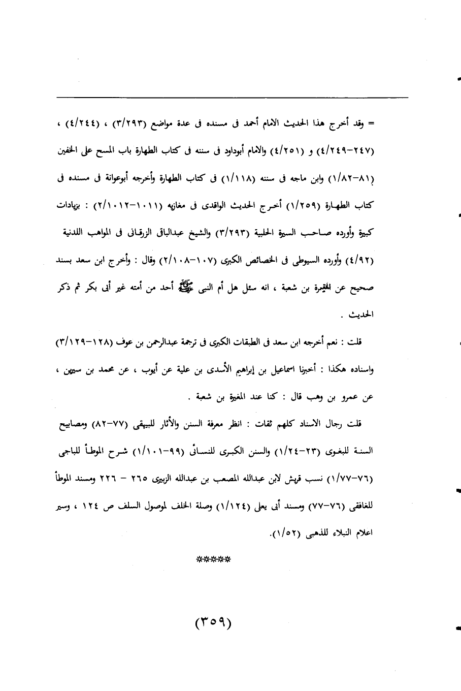 = وقد أخرج هذا الحديث الإمام أحمد فى مسنده فى عدة مواضع (293/ 3)، (244/ 4)، (247 - 249/ 4) و (251/ 4) والامام أبو داود فى سننه فى كتاب الطهارة باب المسح عل الخفين (81 - 82/ 1) وابن ماجه فى سننه (118/ 1) فى كتاب الطهارة وأخرجه أبو عوانة فى مسنده فى كتاب الطهارة (259/ 1) أخرج الحديث الواقدى فى مغازيه (1011 - 1012/ 2): بزيادات كبيرة وأورده صاحب السيرة الحلبية (293/ 3) والشيخ عبد الباقى الزرقاني فى المواهب اللدنية (92/ 4) وأورده السيوطى فى الخصائص الكبرى (107 - 108/ 2) وقال: وأخرج ابن سعد بسند صحيح عن المغيرة بن شعبة، أنه سئل هل أم النبي -صلى اللَّه عليه وسلم- أحد من أمته غير أبى بكر ثم ذكر الحديث.