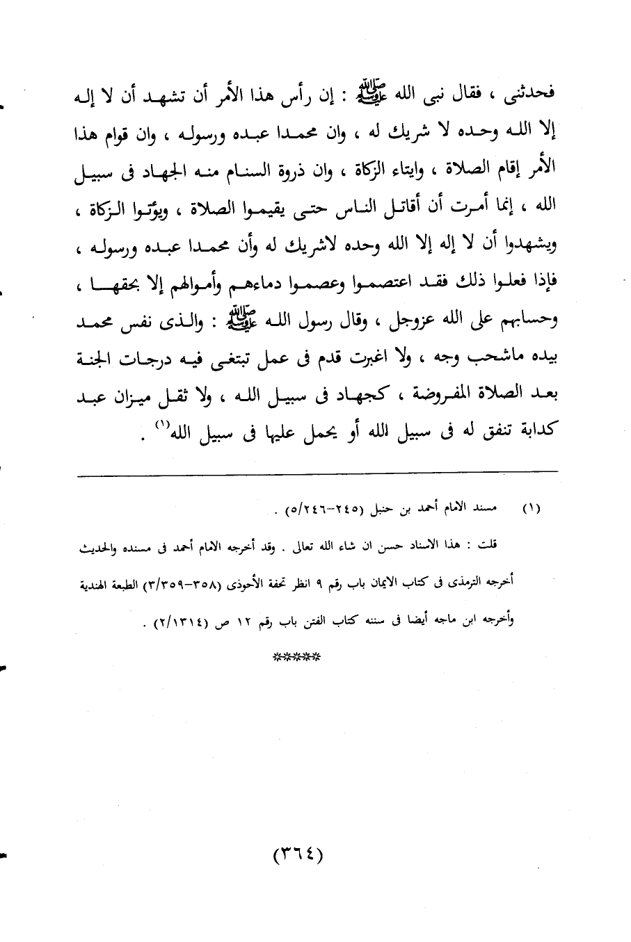 فحدثنى، فقال نبى اللَّه -صلى اللَّه عليه وسلم-: إن رأس هذا الأمر أن تشهد أن لا إله إلا اللَّه وحده لا شريك له، وأن محمدا عبده ورسوله، وان قوام هذا الأمر إقام الصلاة، وايتاء الزكاة، وان ذروة السنام منه الجهاد فى سبيل اللَّه، إنما أمرت أن أقاتل الناس حتى يقيموا الصلاة، ويؤتوا الزكاة، ويشهدوا أن لا إله إلا اللَّه وحده لا شريك له وأن محمدا عبده ورسوله، فإذا فعلوا ذلك فقد اعتصموا وعصموا دماءهم وأموالهم إلا بحقها، وحسابهم على اللَّه عز وجل، وقال رسول اللَّه -صلى اللَّه عليه وسلم-: والذى نفس محمد بيده ما شحب وجه، ولا اغبرت قدم فى عمل تبتغى فيه درجات الجنة بعد الصلاة المفروضة، كجهاد فى سبيل اللَّه، ولا ثقل ميزان عبد كدابة تنفق له فى سبيل اللَّه أو يحمل عليها فى سبيل اللَّه (¬1).