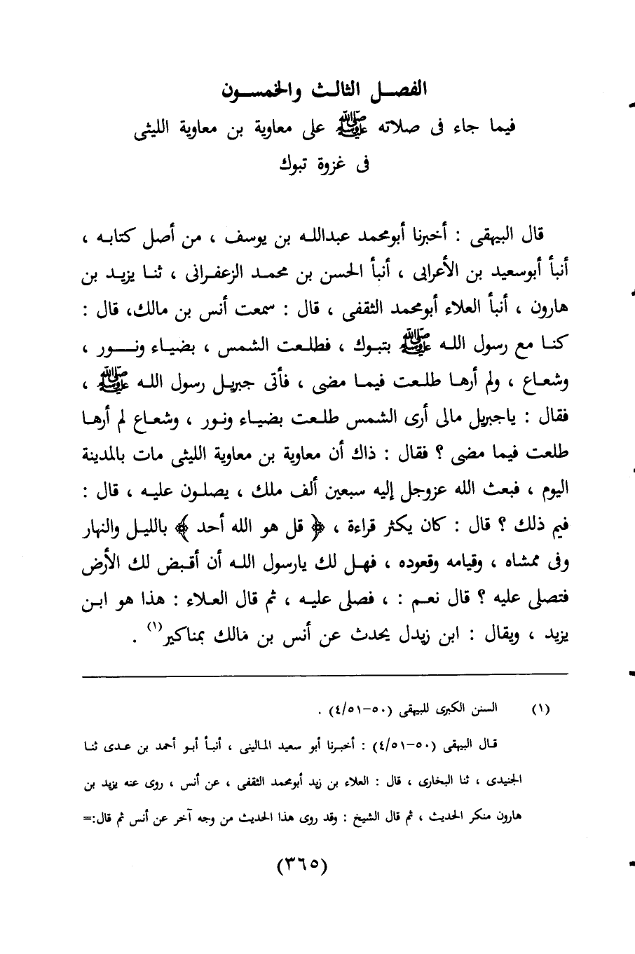 قال البيهقى: أخبرنا أبو محمد عبد اللَّه بن يوسف، من أصل كتابه، أنبأ أبو سعيد بن الأعرابى، أنبأ الحسن بن محمد الزعفرانى، ثنا يزيد بن هارون، أنبأ العلاء أبو محمد الثقفى، قال: سمعت أنس بن مالك، قال: كنا مع رسول اللَّه -صلى اللَّه عليه وسلم- بتبوك، فطلعت الشمس، بضياء ونور، وشعاع، ولم أرها طلعت فيما مضى، فأتى جبريل رسول اللَّه -صلى اللَّه عليه وسلم-، فقال: يا جبريل مالى أرى الشمس طلعت بضياء ونور، وشعاع لم أرها طلعت فيما مضى؟ فقال: ذاك أن معاوية بن معاوية الليثى مات بالمدينة اليوم، فبعث اللَّه عز وجل إليه سبعين ألف ملك، يصلون عليه، قال: فيم ذلك؟ قال: كان يكثر قراءة، {قُلْ هُوَ اللَّهُ أَحَدٌ} بالليل والنهار وفى ممشاه، وقيامه وقعوده، فهل لك يا رسول اللَّه أن أقبض لك الأرض فتصلى عليه؟ قال نعم:، فصلى عليه، ثم قال العلاء: هذا هو ابن يزيد، ويقال: ابن زيدل يحدث عن أنس بن مالك بمناكير (¬1).