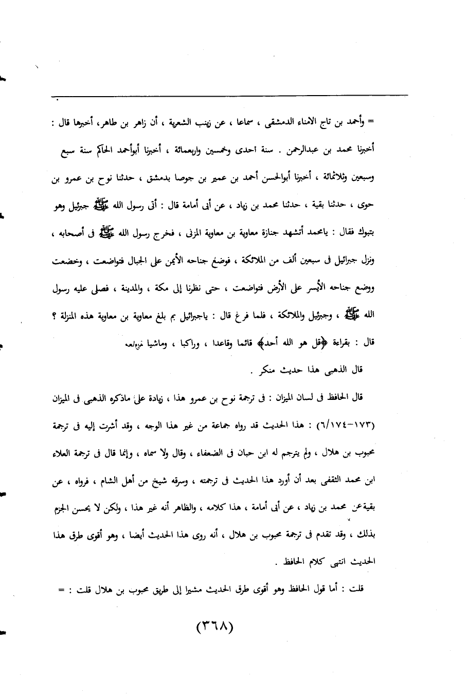 قال الحافظ فى لسان الميزان: فى ترجمة نوح بن عمرو هذا، زيادة على ما ذكره الذهبى فى الميزان (173 - 174/ 6): هذا الحديث قد رواه جماعة من غير هذا الوجه، وقد أشرت إليه فى ترجمة محبوب بن هلال، ولم يترجم له ابن حبان فى الضعفاء، وقال ولا سماه، وإنما قال فى ترجمة العلاء ابن محمد الثقفى بعد أن أورد هذا الحديث فى ترجمته، وسرقه شيخ من أهل الشام، فرواه، عن بقية عن محمد بن زياد، عن أبى أمامة، هذا كلامه، والظاهر أنه غير هذا، ولكن لا يحسن الجزم بذلك، وقد تقدم فى ترجمة محبوب بن هلال، أنه روى هذا الحديث أيضًا، وهو أقوى طرق هذا الحديث انتهى كلام الحافظ.