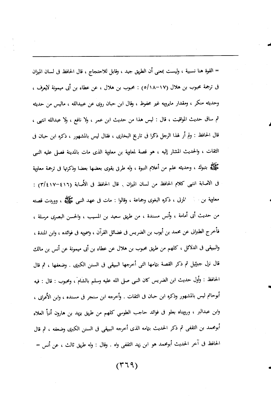 = القوة هنا نسبية، وليست بمعنى أن الطريق جيد، وقابل للاحتجاج، قال الحافظ فى لسان الميزان فى ترجمة محبوب بن هلال (17 - 18/ 5): محبوب بن هلال، عن عطاء بن أبى ميمونة لا يعرف، وحديثه منكر، ومقدار ما يرويه غير محفوظ، وقال ابن حبان روى عن عبيد اللَّه، ما ليس من حديثه ثم ساق حديث المواقيت، قال: ليس هذا من حديث ابن عمر، ولا نافع، ولا عبد اللَّه انتهى، قال الحافظ: ولم أر لهذا الرجل ذكرا فى تاريخ البخارى، فقال ليس بالمشهور، ذكره ابن حبان فى الثقات، والحديث المشار إليه، هو قصة لمعاوية بن معاوية الذى مات بالمدينة فصلى عليه النبي -صلى اللَّه عليه وسلم- بتبوك، وحديثه علم من أعلام النبوة، وله طرق يقوى بعضها بعضا وذكرتها فى ترجمة معاوية فى الاصابة انتهى كلام الحافظ من لسان الميزان. قال الحافظ فى الإصابة (416 - 417/ 3): معاوية بن معاوية المزنى، ذكره البغوى وجماعة، وقالوا: مات فى عهد النبي -صلى اللَّه عليه وسلم-، ووردت قصته من حديث أبى أمامة، وأنس مسندة، من طريق سعيد بن المسيب، والحسن البصرى مرسلة، فأخرج الطبرانى عن محمد بن أيوب بن الضريس فى فضائل القرآن، وسمويه فى فوائده، وابن المندة، والبيهقى فى الدلائل، كلهم من طريق محبوب بن هلال عن عطاء بن أبى ميمونة عن أنس بن مالك قال نزل جبرئيل ثم ذكر القصة بتمامها التى أخرجها البيهقى فى السنن الكبرى. وضعفها، ثم قال الحافظ: وأول حديث ابن الضريس كان النبي صلى اللَّه عليه وسلم بالشام، ومحبوب: قال: فيه أبو حاتم ليس بالمشهور وذكره ابن حبان فى الثقات. وأخرجه ابن سنجر فى مسنده، وابن الأعرابى، وابن عبد البر، ورويناه بعلو فى فوائد حاجب الطوسي كلهم من طريق يزيد بن هارون أنبأ العلاء أبو محمد بن الثقفى ثم ذكر الحديث بتمامه الذى أخرجه البيهقى فى السنن الكبرى وضعفه، ثم قال الحافظ فى آخر الحديث أبو محمد هو ابن زيد الثقفى واه. وقال: وله طريق ثالث، عن أنس =