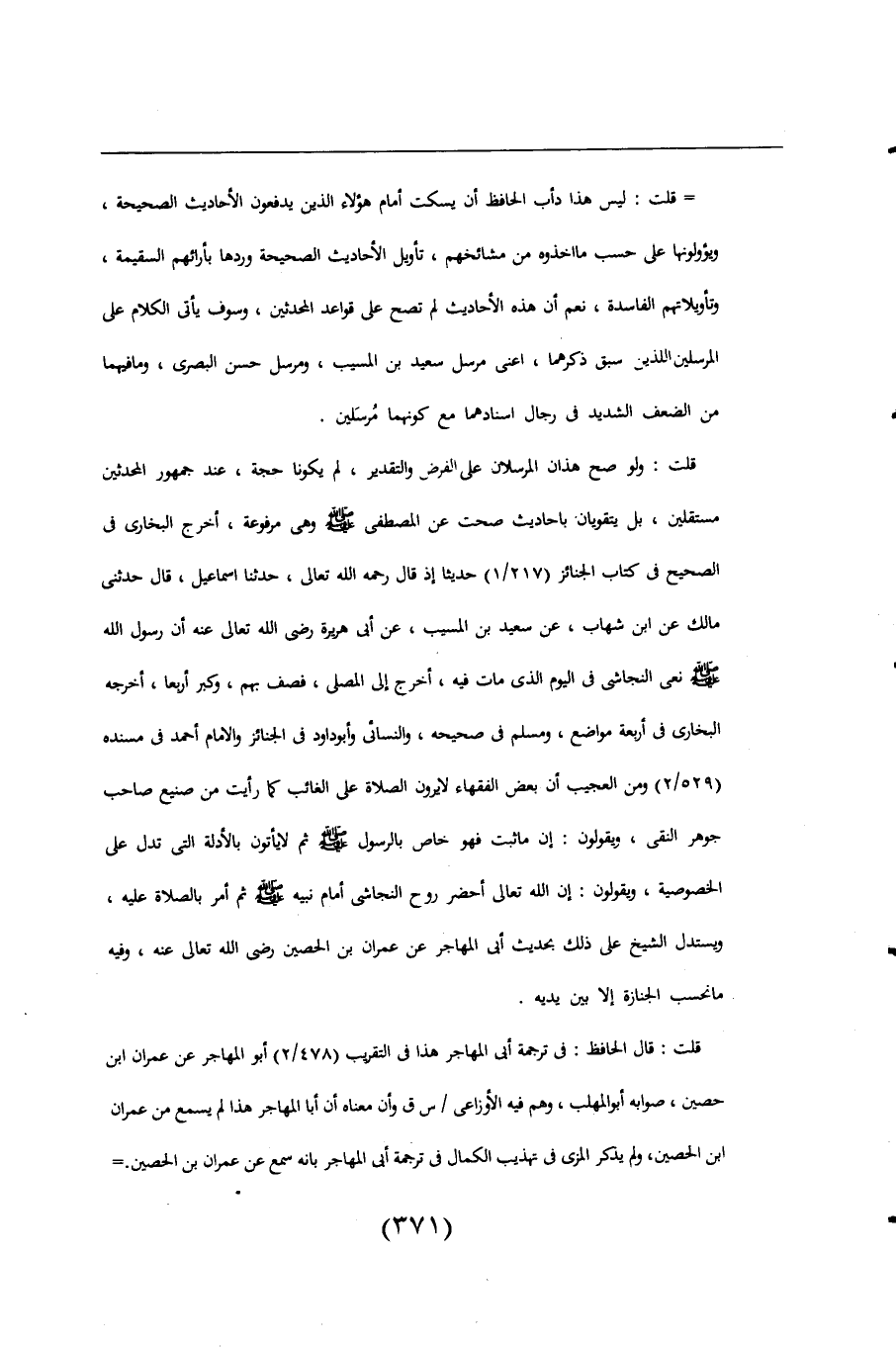 قلت: ولو صع هذان المرسلان على الفرض والتقدير، لم يكونا حجة، عند جمهور المحدثين مستقلين، بل يتقويان باحاديث صحت عن المصطفى -صلى اللَّه عليه وسلم- وهى مرفوعة، أخرج البخارى فى الصحيح فى كتاب الجنائز (217/ 1) حديثا إذ قال رحمه اللَّه تعالى، حدثنا اسماعيل، قال حدثنى مالك عن ابن شهاب، عن سعيد بن المسيب، عن أبى هريرة رضي اللَّه تعالى عنه أن رسول اللَّه -صلى اللَّه عليه وسلم- نعى النجاشي فى اليوم الذى مات فيه، أخرج الى المصلى، فصف بهم، وكبر أربعا، أخرجه البخارى فى أربعة مواضع، ومسلم فى صحيحه، والنسائى وأبو داود فى الجنائز والإمام أحمد فى مسنده (529/ 2) ومن العجيب أن بعض الفقهاء لا يرون الصلاة على الغائب كما رأيت من صنيع صاحب جوهر النقى، ويقولون: إن ما ثبت فهو خاص بالرسول -صلى اللَّه عليه وسلم- ثم لا يأتون بالأدلة التى تدل على الخصوصية، ويقولون: إن اللَّه تعالى أحضر روح النجاشى أمام نبيه -صلى اللَّه عليه وسلم- ثم أمر بالصلاة عليه، ويستدل الشيخ على ذلك بحديث أبى المهاجر عن عمران بن الحصين رضي اللَّه تعالى عنه، وفيه ما نحسب الجنازة إلا بين يديه.