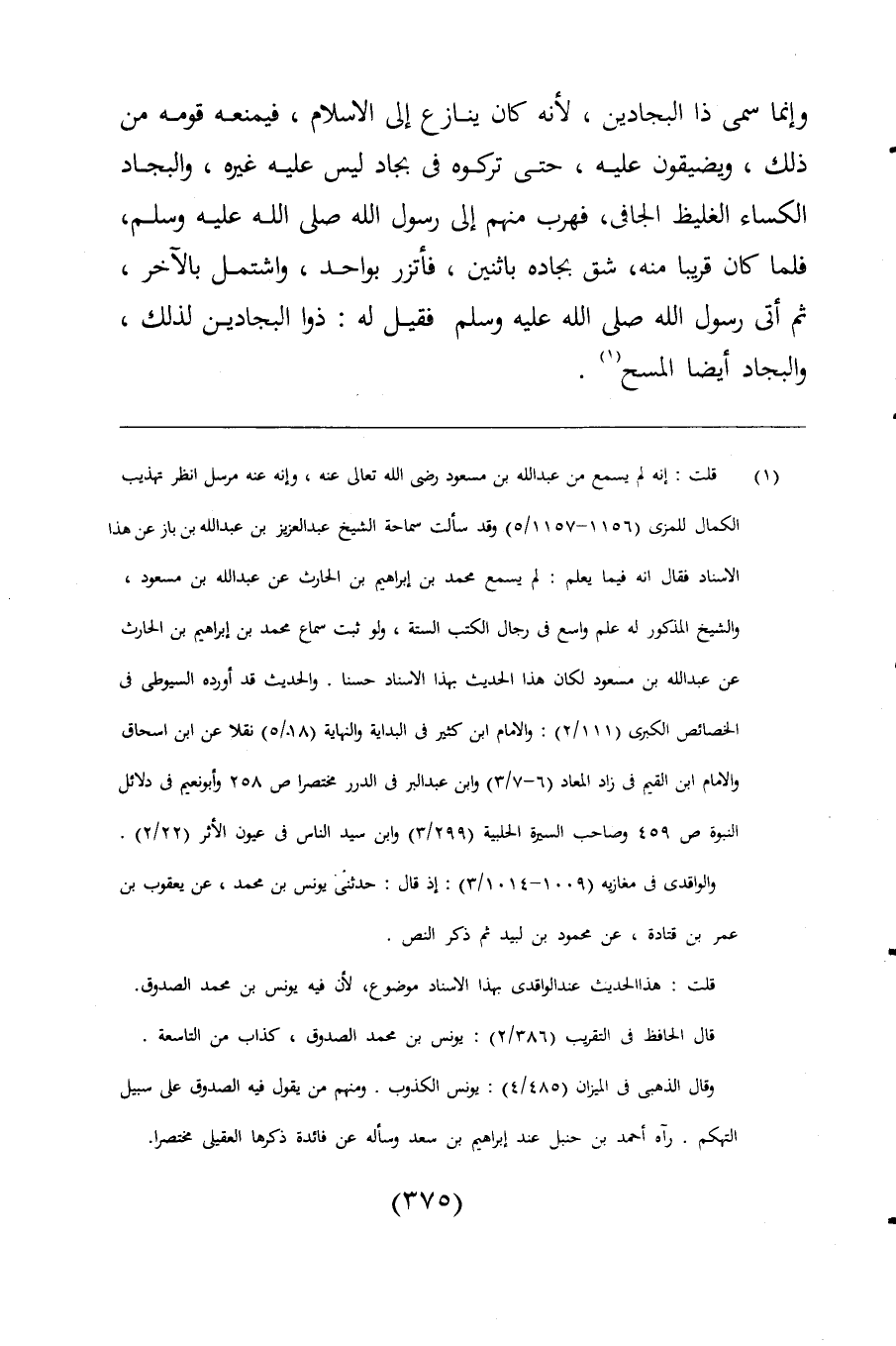 (¬1) قلت: إنه يسمع من عبد اللَّه بن مسعود رضي اللَّه تعالى عنه، وإنه عنه مرسل انظر تهذيب الكمال للمزى (1156 - 1157/ 5) وقد سألت سماحة الشيخ عبد العزيز بن عبد اللَّه بن باز عن هذا الاسناد فقال انه فيما يعلم: لم يسمع محمد بن إبراهيم بن الحارث عن عبد اللَّه بن مسعود، والشيخ المذكور له علم واسع فى رجال الكتب الستة، ولو ثبت سماع محمد بن إبراهيم بن الحارث عن عبد اللَّه بن مسعود لكان هذا الحديث بهذا الاسناد حسنا. والحديث قد أورده السيوطى فى الخصائص الكبرى (111/ 2): والامام ابن كثير فى البداية والنهاية (18/ 5) نقلا عن ابن اسحاق والامام ابن القيم فى زاد المعاد (6 - 7/ 3) وابن عبد البر فى الدرر مختصرا ص 258 وأبو نعيم فى دلائل النبوة ص 459 وصاحب السيرة الحلبية (3/ 299) وابن سيد الناس فى عيون الأثر (22/ 2). والواقدى فى مغازيه (1009 - 1014/ 3): إذ قال: حدثنى يونس بن محمد، عن يعقوب بن عمر بن قتادة، عن محمود بن لبيد ثم ذكر النص.
