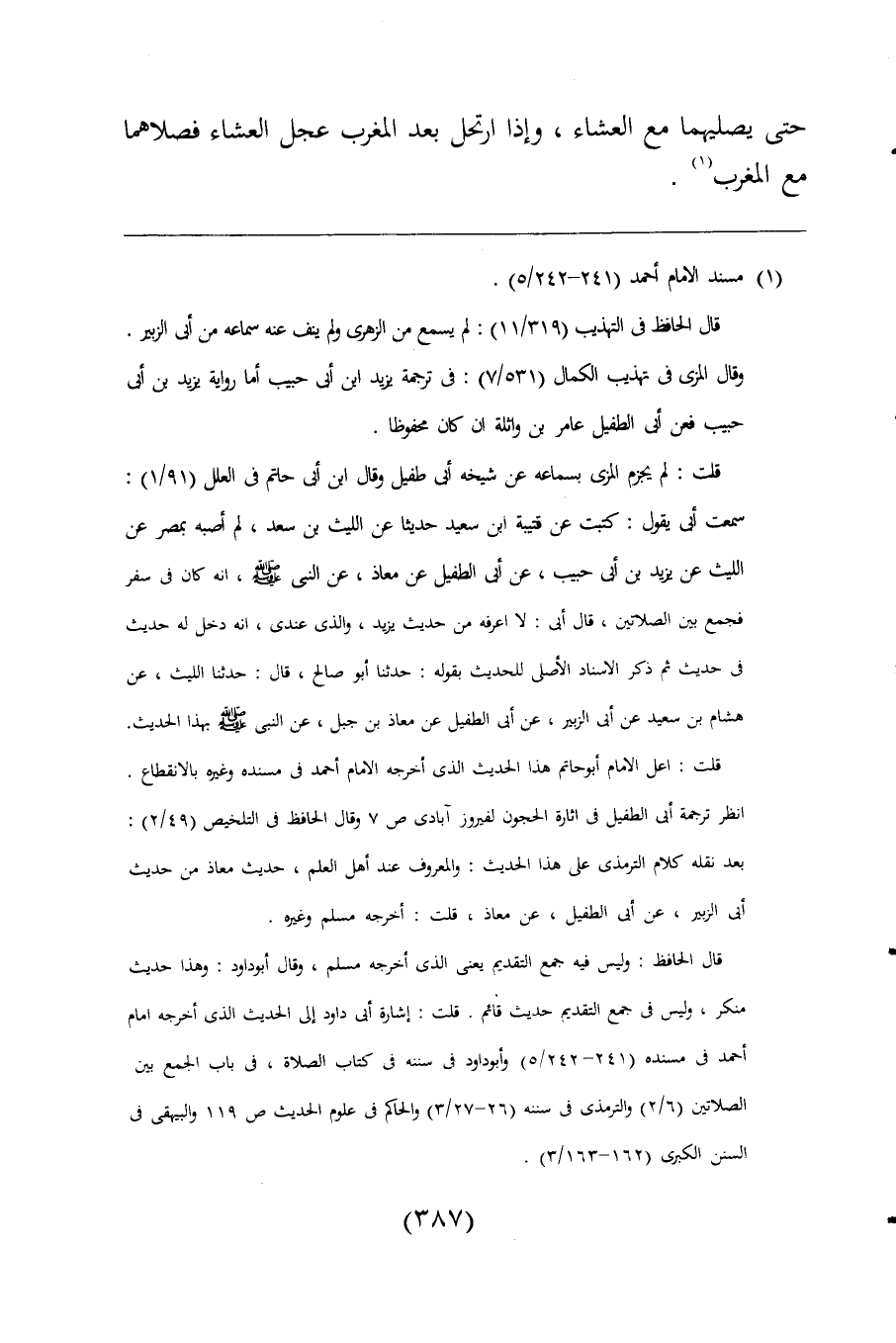 قلت: اعل الامام أبو حاتم هذا الحديث الذى أخرجه الإمام أحمد فى مسنده وغيره بالانقطاع. انظر ترجمة أبى الطفيل فى اثارة الحجون لفيروزآبادى ص 7 وقال الحافظ فى التلخيص (49/ 2): بعد نقله كلام الترمذى على هذا الحديث: والمعروف عند أهل العلم، حديث معاذ من حديث أبى الزبير، عن أبى الطفيل، عن معاذ، قلت: أخرجه مسلم وغيره.
