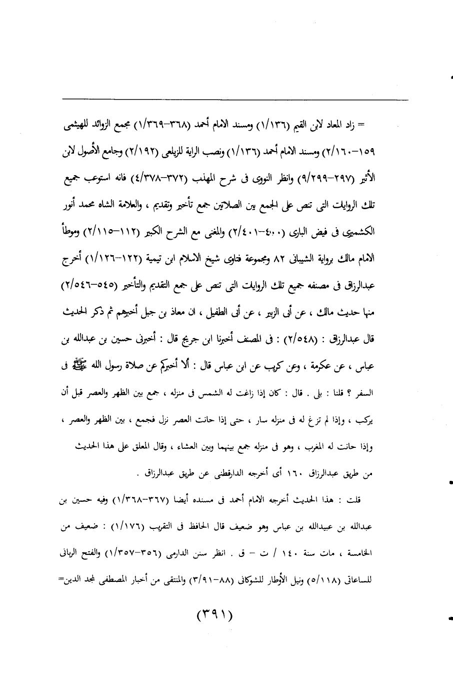 = زاد المعاد لابن القيم (136/ 1) ومسند الإمام أحمد (368 - 369/ 1) مجمع الزوائد للهيثمى (159 - 160/ 2) ومسند الإمام أحمد (136/ 1) ونصب الراية للزيلعى (192/ 2) وجامع الأصول لابن الأثير (297 - 299/ 9) وانظر النووي فى شرح المهذب (372 - 378/ 4) فانه استوعب جميع تلك الروايات التى تنص على الجمع بين الصلاتين جمع تأخير وتقديم، والعلامة الشاه محمد أنور الكشميري فى فيض البارى (400 - 401/ 2) والمغنى مع الشرح الكبير (112 - 115/ 2) وموطأ الامام مالك برواية الشيبانى 82 ومجموعة فتاوى شيخ الاسلام ابن تيمية (122 - 126/ 1) أخرج عبد الرزاق فى مصنفه جميع تلك الروايات التى تنص على جمع التقديم والتأخير (545 - 546/ 2) منها حديث مالك، عن أبى الزبير، عن أبى الطفيل، ان معاذ بن جبل أخبرهم ثم ذكر الحديث قال عبد الرزاق: (548/ 2): فى المصنف أخبرنا ابن جريج قال: أخبرنى حسين بن عبد اللَّه بن عباس، عن عكرمة، وعن كريب عن ابن عباس قال: ألا أخبركم عن صلاة رسول اللَّه -صلى اللَّه عليه وسلم- فى السفر؟ قلنا: بلى. قال: كان إذا زاغت له الشمس فى منزله، جمع بين الظهر والعصر قبل أن يركب، وإذا لم تزغ له فى منزله سار، حتى إذا حانت العصر نزل فجمع، بين الظهر والعصر، وإذا حانت له المغرب، وهو فى منزله جمع بينهما وبين العشاء، وقال المعلق على هذا الحديث من طريق عبد الرزاق 160 أى أخرجه الدارقطنى عن طريق عبد الرزاق.