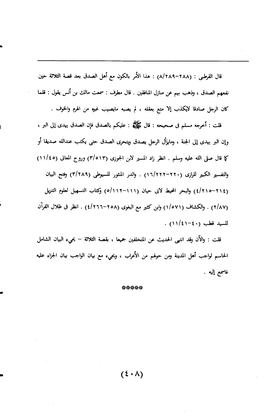 قلت: أخرجه مسلم فى صحيحه: قال -صلى اللَّه عليه وسلم-: عليكم بالصدق فإِن الصدق يهدى الى البر، وإِن البر يهدى الى الجنة، وما يزال الرجل يصدق ويتحرى الصدق حتى يكتب عند اللَّه صديقا أو كما قال صلى اللَّه عليه وسلم. انظر زاد المسير لابن الجوزى (513/ 3) وروح المعانى (45/ 11) والتفسير الكبير للرازى (220 - 222/ 16). والدر المنثور للسيوطى (289/ 3) وفتح البيان (214 - 215/ 4) والبحر المحيط لأبي حيان (111 - 112/ 5) وكتاب التسهيل لعلوم التنزيل (87/ 2). والكشاف (571/ 1) وابن كثير مع البغوى (258 - 266/ 4). انظر فى ظلال القرآن للسيد قطب (40 - 41/ 11).