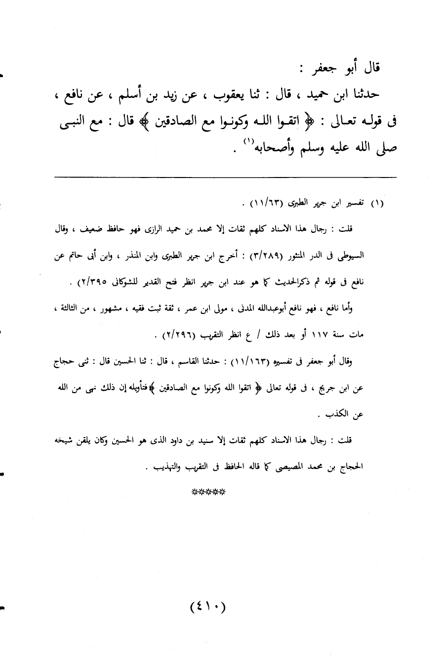 حدثنا ابن حميد، قال: ثنا يعقوب، عن زيد بن أسلم، عن نافع، فى قوله تعالى: {اتَّقُوا اللَّهَ وَكُونُوا مَعَ الصَّادِقِينَ} قال: مع النبي صلى اللَّه عليه وسلم وأصحابه (¬1).