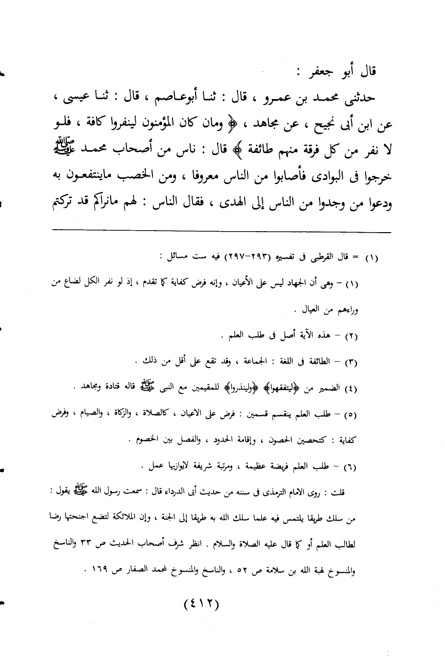 حدثنى محمد بن عمرو، قال: ثنا أبو عاصم، قال: ثنا عيسى، عن ابن أبى نجيح، عن مجاهد، {وَمَا كَانَ الْمُؤْمِنُونَ لِيَنْفِرُوا كَافَّةً فَلَوْلَا نَفَرَ مِنْ كُلِّ فِرْقَةٍ مِنْهُمْ طَائِفَةٌ} قال: ناس من أصحاب محمد -صلى اللَّه عليه وسلم- خرجوا فى البوادى فأصابوا من الناس معروفا، ومن الخصب ما ينتفعون به ودعوا من وجدوا من الناس الى الهدى، فقال الناس: لهم ما نراكم قد تركتم