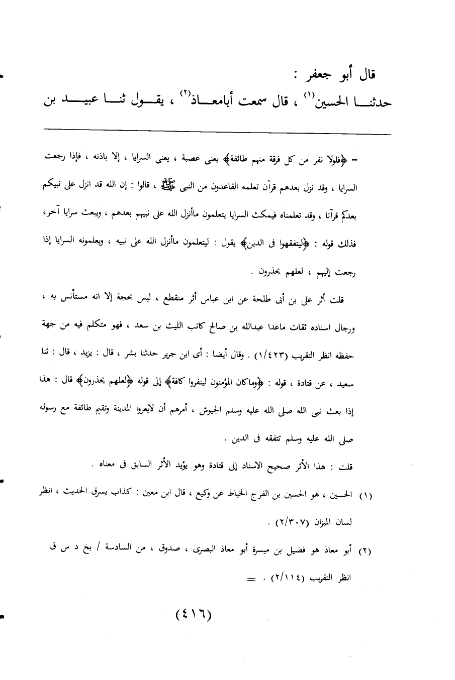 قلت أثر علي بن أبى طلحة عن ابن عباس أثر منقطع، ليس بحجة إلا أنه مستأنس به، ورجال إسناده ثقات ما عدا عبد اللَّه بن صالح كاتب الليث بن سعد، فهو متكلم فيه من جهة حفظه انظر التقريب (423/ 1). وقال أيضًا: أى ابن جرير حدثنا بشر، قال: يزيد، قال: ثنا سعيد، عن قتادة، قوله: {وَمَا كَانَ الْمُؤْمِنُونَ لِيَنْفِرُوا كَافَّةً} إلى قوله {لَعَلَّهُمْ يَحْذَرُونَ} قال: هذا إذا بعث نبى اللَّه صلى اللَّه عليه وسلم الجيوش، أمرهم أن لا يعروا المدينة وتقيم طائفة مع رسوله صلى اللَّه عليه وسلم تتفقه فى الدين.