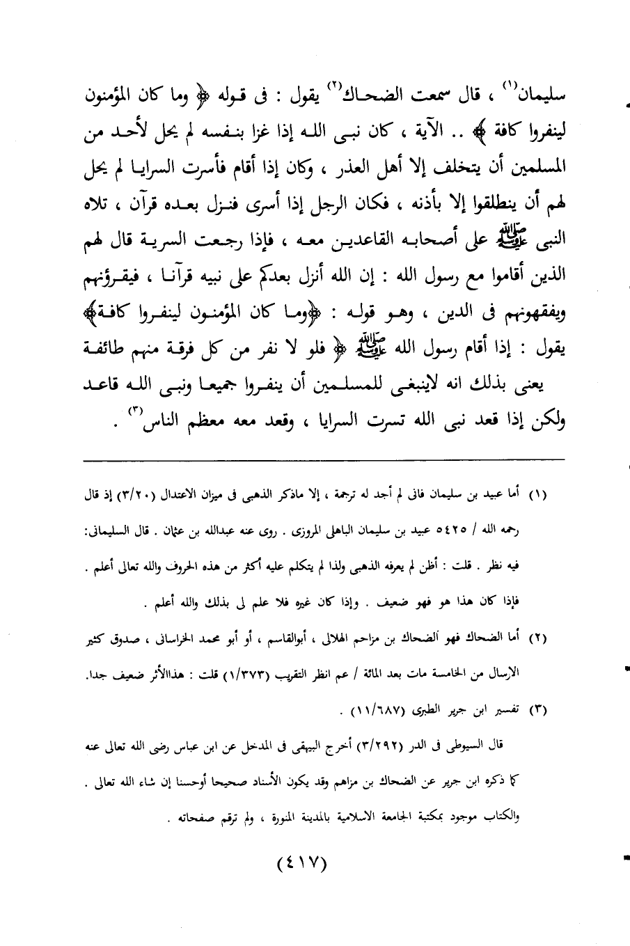 سليمان (¬1)، قال سمعت الضحاك (¬2) يقول: فى قوله {وَمَا كَانَ الْمُؤْمِنُونَ لِيَنْفِرُوا كَافَّةً}. . الآية، كان نبى اللَّه إذا غزا بنفسه لم يحل لأحد من المسلمين أن يتخلف إلا أهل العذر، وكان إذا أقام فأسرت السرايا لم يحل لهم أن ينطلقوا إلا بأذنه، فكان الرجل إذا أسرى فنزل بعده قرآن، تلاه النبي -صلى اللَّه عليه وسلم- على أصحابه القاعدين معه، فإذا رجعت السرية قال لهم الذين أقاموا مع رسول اللَّه: إن اللَّه أنزل بعدكم على نبيه قرآنا، فيقرؤنهم ويفقهونهم فى الدين، وهو قوله: {وَمَا كَانَ الْمُؤْمِنُونَ لِيَنْفِرُوا كَافَّةً} يقول: إذا أقام رسول اللَّه -صلى اللَّه عليه وسلم- {فَلَوْلَا نَفَرَ مِنْ كُلِّ فِرْقَةٍ مِنْهُمْ طَائِفَةٌ} يعنى بذلك أنه لا ينبغى للمسلمين أن ينفروا جميعًا ونبى اللَّه قاعد ولكن إذا قعد نبى اللَّه تسرت السرايا، وقعد معه معظم الناس (¬3).