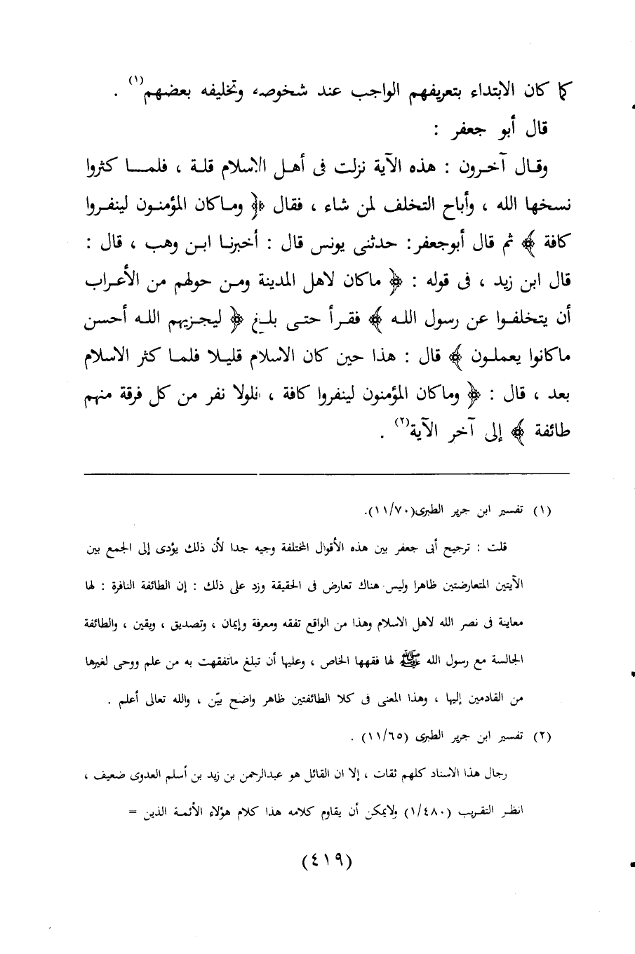 قلت: ترجيح أبى جعفر بين هذه الأقوال المختلفة وجيه جدا لأن ذلك يؤدى الى الجمع بين الآيتين المتعارضتين ظاهرا وليس هناك تعارض فى الحقيقة وزد على ذلك: إن الطائفة النافرة: لها معاينة فى نصر اللَّه لأهل الإسلام وهذا من الواقع تفقه ومعرفة وإيمان، وتصديق، ويقين، والطائفة الجالسة مع رسول اللَّه -صلى اللَّه عليه وسلم- لها فقهها الخاص، وعليها أن تبلغ ما تفقهت به من علم ووحى لغيرها من القادمين إليها، وهذا المعنى فى كلا الطائفتين ظاهر واضح بيّن، واللَّه تعالى أعلم.