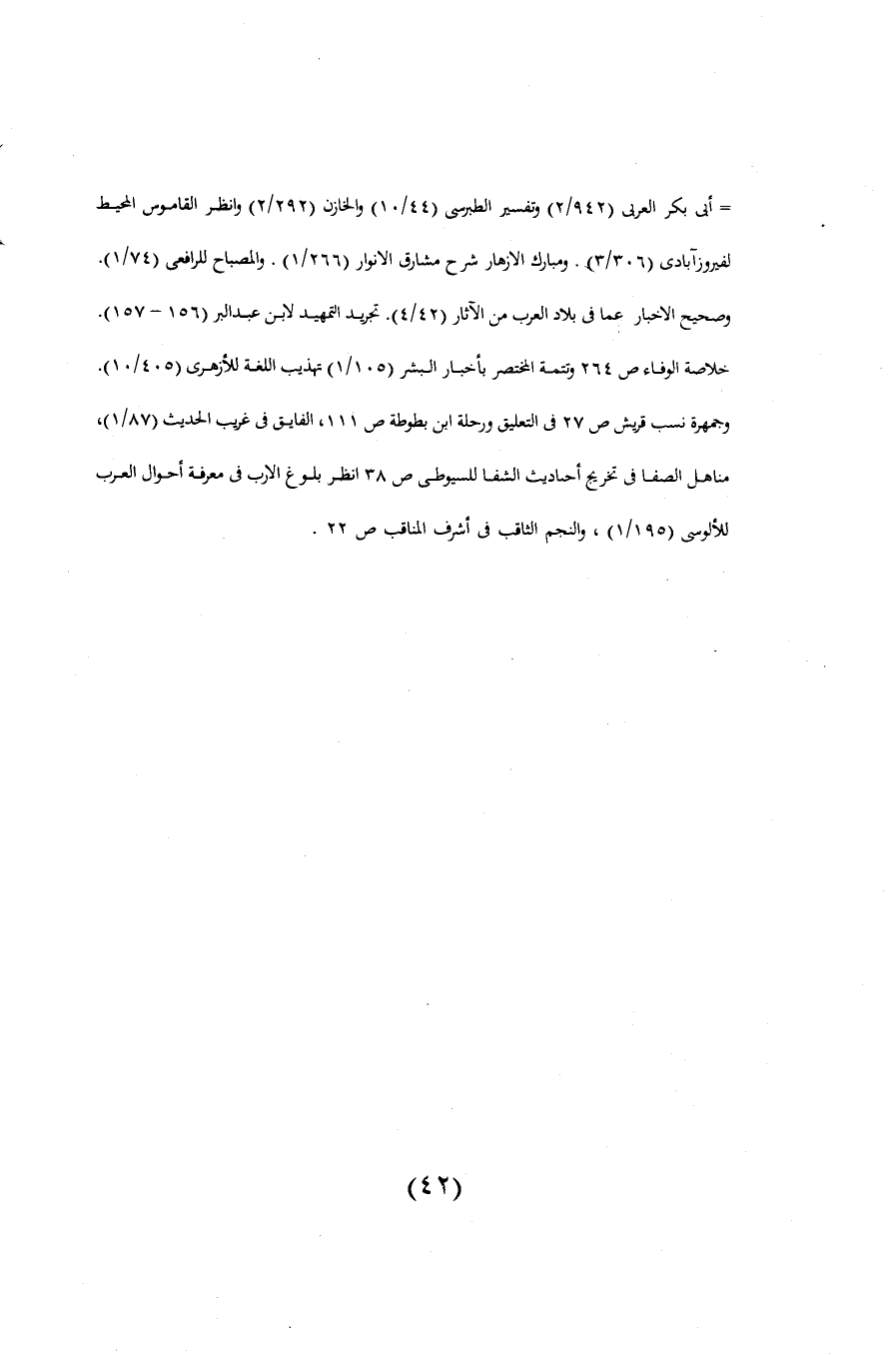 = أبى بكر العربى (942/ 2) وتفسير الطبرسى (44/ 10) والخازن (292/ 2) وانظر القاموس المحيط لفيروزآبادى (306/ 3). ومبارك الازهار شرح مشارق الانوار (266/ 1). والمصباح للرافعى (74/ 1). وصحيح الاخبار عما فى بلاد العرب من الآثار (42/ 4). تجريد التمهيد لابن عبد البر (156 - 157). خلاصة الوفاء ص 264 وتتمة المختصر بأخبار البشر (105/ 1) تهذيب اللغة للأزهرى (405/ 10). وجمهرة نسب قريش ص 27 فى التعليق ورحلة ابن بطوطة ص 111، الفايق فى غريب الحديث (87/ 1)، مناهل الصفا فى تخرج أحاديث الشفا للسيوطى ص 38 انظر بلوغ الارب فى معرفة أحوال العرب للألوسى (195/ 1)، والنجم الثاقب فى أشرف المناقب ص 22.