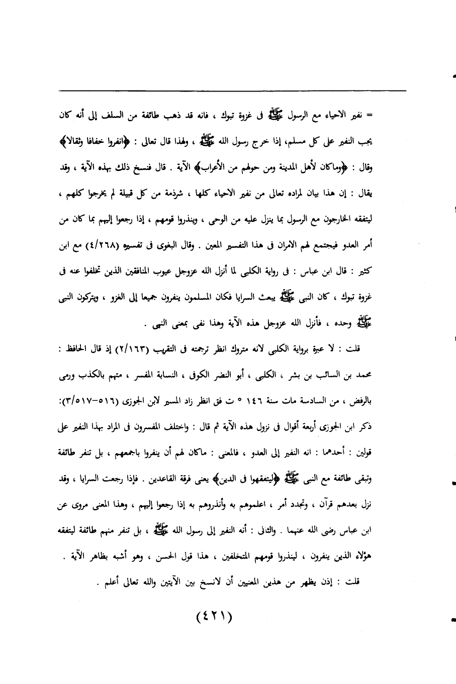 = نفير الاحباء مع الرسول -صلى اللَّه عليه وسلم- فى غزوة تبوك، فإنه قد ذهب طائفة من السلف الى أنه كان يجب النفير على كل مسلم، إذا خرج رسول اللَّه -صلى اللَّه عليه وسلم-، ولهذا قال تعالى: {انْفِرُوا خِفَافًا وَثِقَالًا} وقال: {مَا كَانَ لِأَهْلِ الْمَدِينَةِ وَمَنْ حَوْلَهُمْ مِنَ الْأَعْرَابِ} الآية. قال فنسخ ذلك بهذه الآية، وقد يقال: إن هذا بيان لمراده تعالى من نفير الأحياء كلها، شرذمة من كل قبيلة لم يخرجوا كلهم، ليتفقه الخارجون مع الرسول بما ينزل عليه من الوحى، وينذروا قومهم، إذا رجعوا إليهم بما كان من أمر العدو فيجتمع لهم الأمران فى هذا التفسر المعين. وقال البغوى فى تفسيره (268/ 4) مع ابن كثير: قال ابن عباس: فى رواية الكلبى لما أنزل اللَّه عز وجل عيوب المنافقين الذين تخلفوا عنه فى غزوة تبوك، كان النبي -صلى اللَّه عليه وسلم- يبعث السرايا فكان المسلمون ينفرون جميعا الى الغزو، ويتركون النبي -صلى اللَّه عليه وسلم- وحده، فأنزل اللَّه عز وجل هذه الآية وهذا نفى بمعنى النهى.
