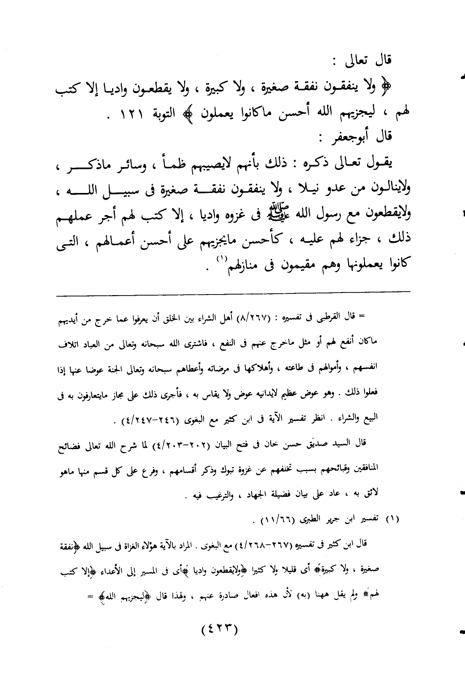 = قال القرطبى فى تفسيره: (267/ 8) أهل الشراء بين الخلق أن يعرفوا عما خرج من أيديهم ما كان أنفع لهم أو مثل ما خرج عنهم فى النفع، فاشترى اللَّه سبحانه وتعالى من العباد اتلاف أنفسهم، وأموالهم فى طاعته، وأهلاكها فى مرضاته وأعطاهم سبحانه وتعالى الجنة عوضا عنها إذا فعلوا ذلك. وهو عوض عظيم لا يدانيه عوض ولا يقاس به، فأجرى ذلك على مجاز ما يتعارفون به فى البيع والشراء. انظر تفسير الآية فى ابن كثير مع البغوى (246 - 247/ 4).