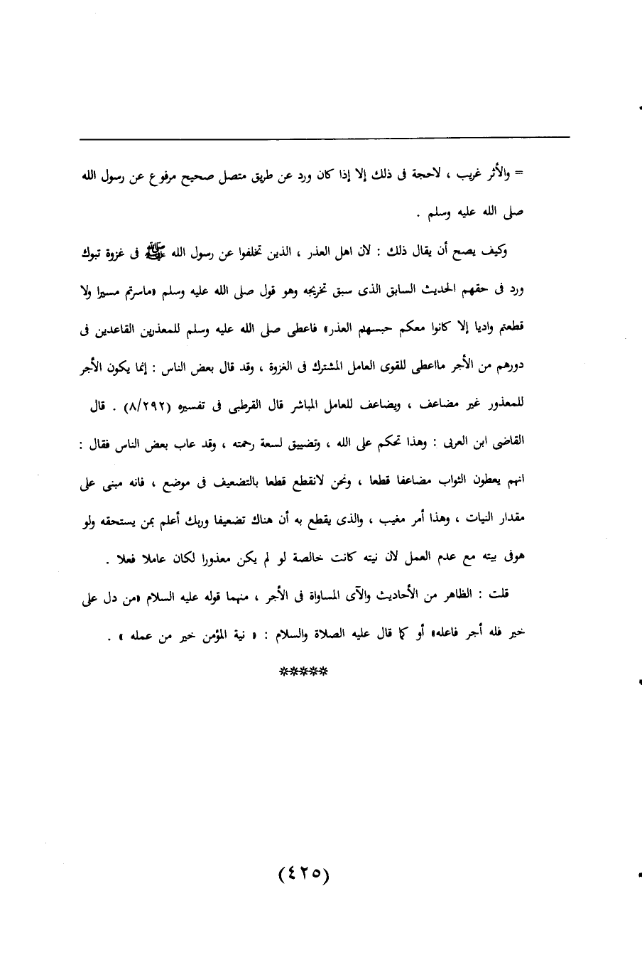كيف يصح أن يقال ذلك: لأن أهل العذر، الذين تخلفوا عن رسول اللَّه -صلى اللَّه عليه وسلم- فى غزوة تبوك ورد فى حقهم الحديث السابق الذى سبق تخريجه وهو قول صلى اللَّه عليه وسلم "ما سرتم مسيرا ولا قطعتم واديا إِلا كانوا معكم حبسهم العذر" فأعطى صلى اللَّه عليه وسلم للمعذرين القاعدين فى دورهم من الأجر ما أعطى للقوى الحامل المشترك فى الغزوة، وقد قال بعض الناس: إنما يكون الأجر للمعذور غير مضاعف، ويضاعف للعامل المباشر قال القرطبى فى تفسيره (292/ 8). قال القاضى ابن العربي: وهذا تحكم على اللَّه، وتضييق لسعة رحمته، وقد عاب بعض الناس فقال: إِنهم يعطون الثواب مضاعفا قطعا، ونحن لا نقطع قطعا بالتضعيف فى موضع، فإنه مبنى على مقدار النيات، وهذا أمر مغيب، والذى يقطع به أن هناك تضعيفا وربك أعلم بمن يستحقه ولو هو فى بيته مع عدم العمل لأن نيته كانت خالصة لو لم يكن معذورا لكان عاملا فعلا.