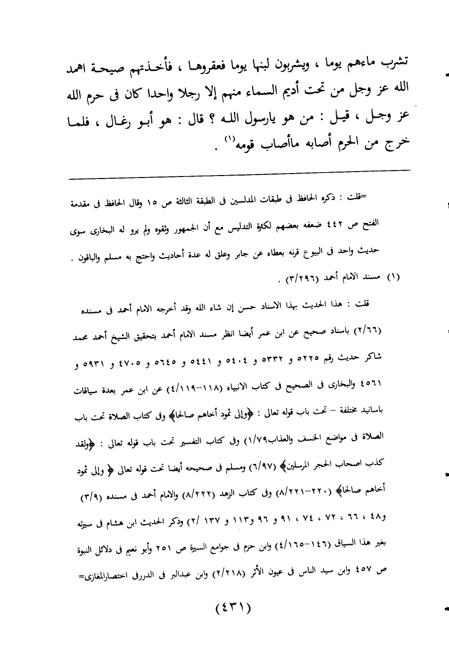 قلت: هذا الحديث بهذا الاسناد حسن إن شاء اللَّه وقد أخرجه الإمام أحمد فى مسنده (66/ 2) بإسناد صحيح عن ابن عمر أيضًا انظر مسند الإمام أحمد بتحقيق الشيخ أحمد محمد شاكر حديث رقم 5225 و 5332 و 5404 و 5441 و 5645 و 4705 و 5931 و 4561 والبخارى فى الصحيح فى كناب الأنبياء (118 - 119/ 4) عن ابن عمر بعدة سياقات بأسانيد مختلفة -تحت باب قوله تعالى: {وَإِلَى ثَمُودَ أَخَاهُمْ صَالِحًا} وفى كتاب الصلاة تحت باب الصلاة فى مواضع الخسف والعقاب (79/ 1) وفى كتاب التفسير تحت باب قوله تعالى: {وَلَقَدْ كَذَّبَ أَصْحَابُ الْحِجْرِ الْمُرْسَلِينَ} (97/ 6) ومسلم فى صحيحه أيضا تحت قوله تعالى {وَإِلَى ثَمُودَ أَخَاهُمْ صَالِحًا} (220 - 221/ 8) وفى كتاب الزهد (222/ 8) والإمام أحمد فى مسنده (9/ 3) و 48، 66، 72، 74، 91 و 96 و 113 و 137/ 2) وذكر الحديث ابن هشام فى سيرته بغير هذا السياق (146 - 165/ 4) وابن حزم فى جوامع السيرة ص 251 وأبو نعيم فى دلائل البوة ص 457 وابن سيد الناس فى عون الأثر (218/ 2) وابن عبد البر فى الدرر فى اختصار المغازى =
