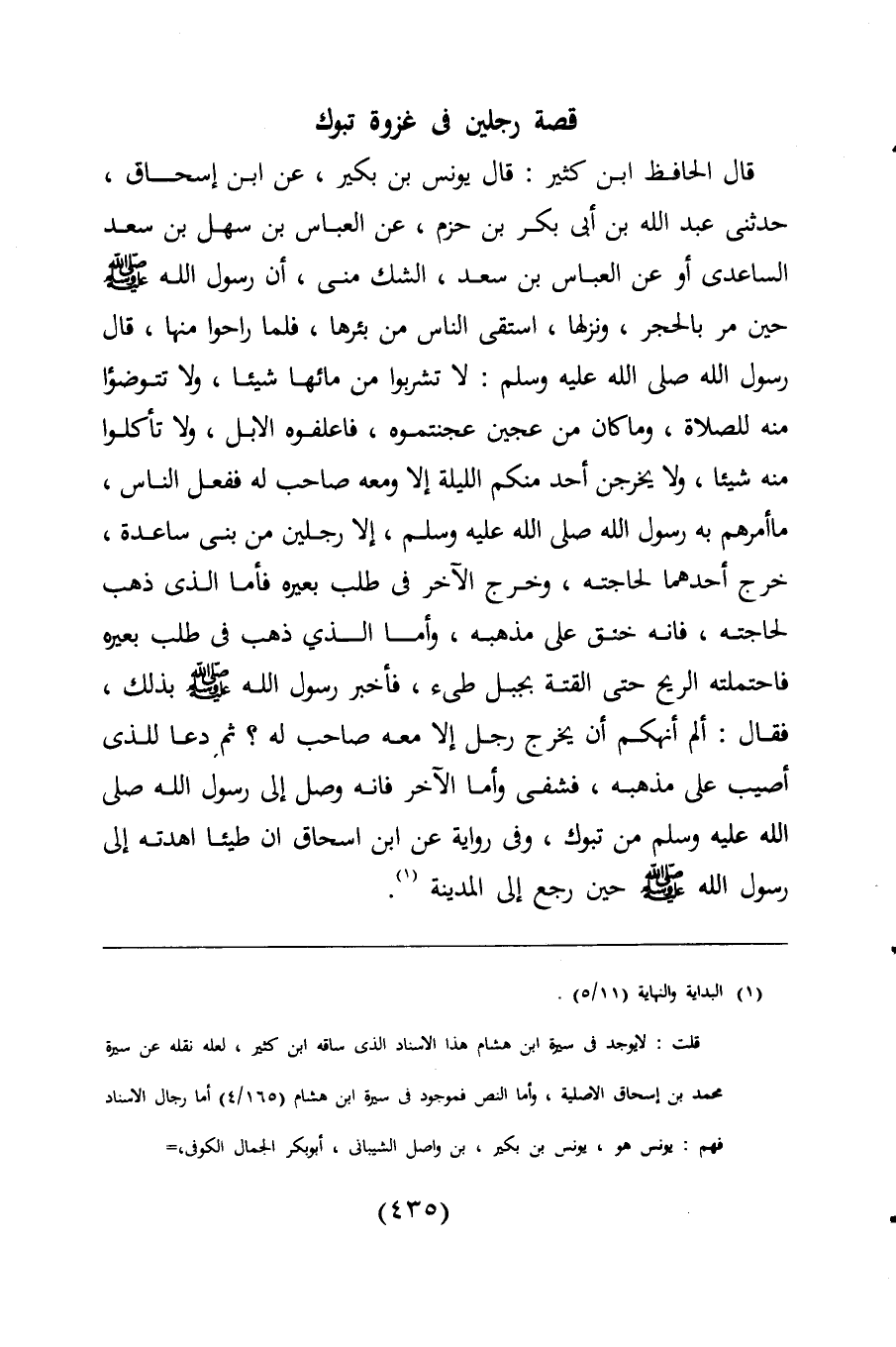 قلت: لا بوجد فى سيرة ابن هشام هذا الاسناد الذى ساقه ابن كثير، لعله نقله عن سيرة محمد بن إسحاق الأصلية، وأما النص فموجود فى سيرة ابن هشام (165/ 4) أما رجال الاسناد فهم: يونس هو، يونس بن بكر، بن واصل الشيبانى، أبو بكر الجمال الكوفى، =