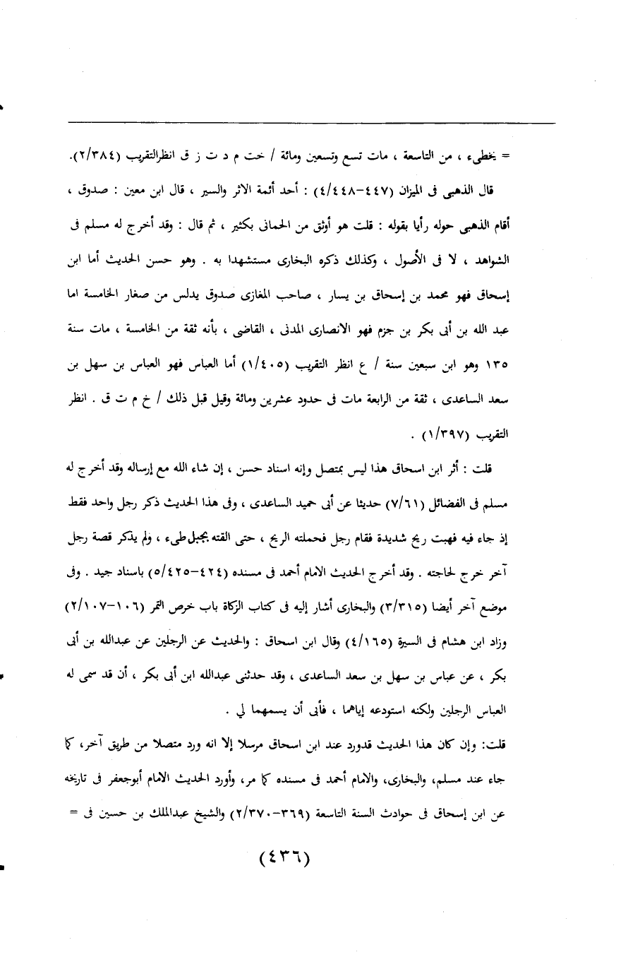 قال الذهبى فى الميزان (447 - 448/ 4): أحد أئمة الأثر والسير، قال ابن معين: صدوق، أقام الذهبي حوله رأيا بقوله: قلت هو أوثق من الحماني بكثير، ثم قال: وقد أخرج له مسلم فى الشواهد، لا فى الأصول، وكذلك ذكره البخارى مستشهدا به. وهو حسن الحديث أما ابن إسحاق فهو محمد بن إسحاق: بن يسار، صاحب المغازى صدوق يدلس من صغار الخامسة اما عبد اللَّه أبى بكر بن جزم فهو الأنصاري المدنى، القاضى، بأنه ثقة من الخامسة، مات سنة 135 وهو ابن سبعين سنة/ ع انظر التقريب (1/ 405) أما العباس فهو العباس بن سهل بن سعد الساعدى، ثقة من الرابعة مات فى حدود عشرين ومائة وقيل قبل ذلك / خ م ت ق. انظر التقريب (397/ 1).