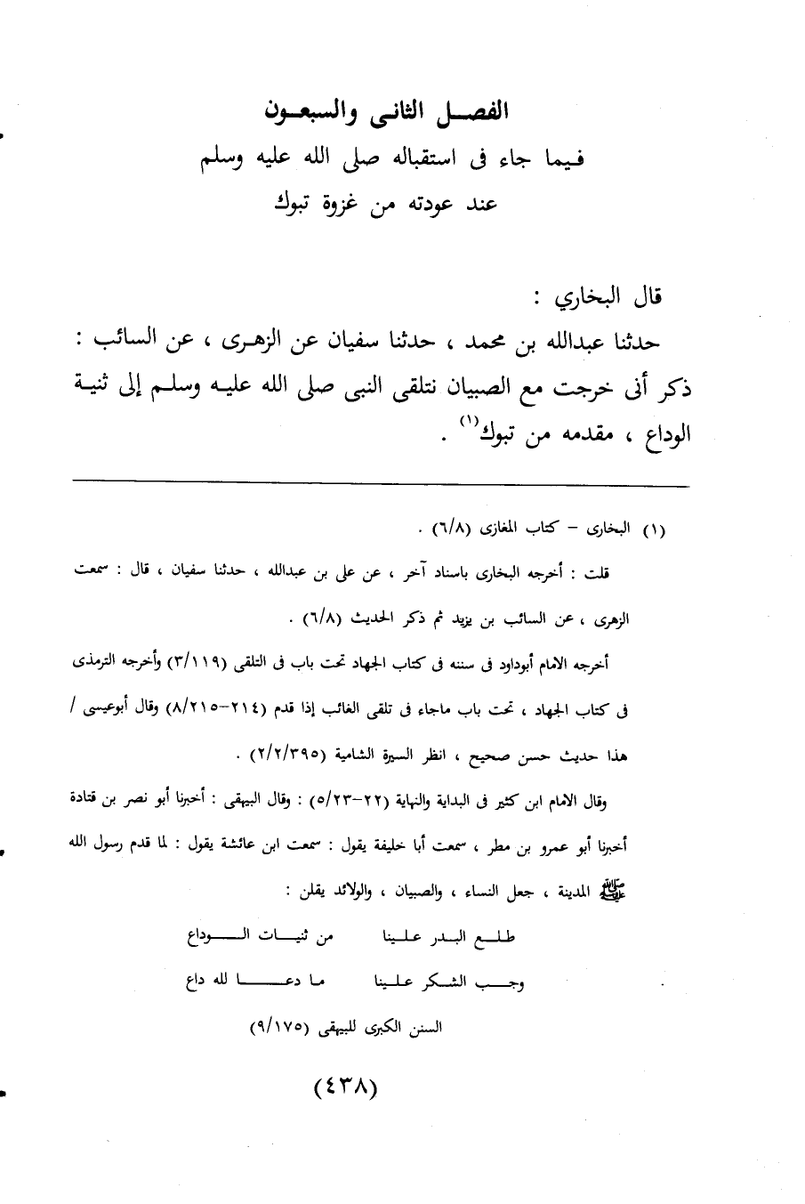 حدثنا عبد اللَّه بن محمد، حدثنا سفيان عن الزهرى، عن السائب: ذكر أن خرجت مع الصبيان نتلقى النبي صلى اللَّه عليه وسلم الى ثنية الوداع، مقدمه من تبوك (¬1).