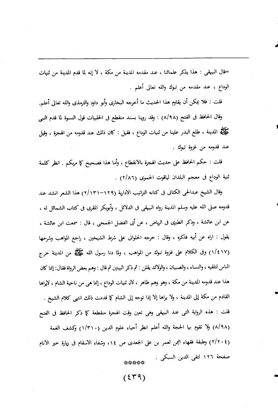 وقال الشيخ عبد الحى الكتاني فى كتابه التراتيب الإدارية (129 - 131/ 2) هذا الشعر أنشد عند قدومه صلى اللَّه عليه وسلم المدينة رواه البيهقي فى الدلائل، وأبو بكر المقرى فى كتاب الشمائل له، عن ابن عائشة، وذكر الطبرى فى الرياض، عن أبى الفضل الجمحى، قال: سمعت ابن عائشة، يقول: أراه عن أبيه فذكره، وقال: خرجه الحلواني على شرط الشيخين، راجع المواهب وشرحها (417/ 1) وفى الكلام على غزوة تبوك من المواهب، ولما دنا رسول اللَّه -صلى اللَّه عليه وسلم- من المدينة خرج الناس لتلقيه، والنساء، والصبيان، والولائد يقلن: ثم ذكر البيتين ثم قال: وهم بعض الرواة فقال: إنما كان هذا عند قدومه المدينة من مكة، وهو وهم ظاهر، لأن ثنيات الوداع، إنما هى من ناحية الأم، لا يراها القادم من مكة الى المدينة، ولا يراها إِلا إذا توجه الى الشام كما قدمت ذلك انتهى كلام الشيخ. قلت: هذه الرواية التى عند البيهقى وهى تعين وقت الهجرة منقطعة كما ذكر الحافظ فى الفتح (98/ 8) ولا تقوم بها الحجة واللَّه أعلم انظر أحياء علوم الدين (310/ 1) وكشف الغمة (204/ 2) وطبقة فقهاء اليمن لعمر بن على الجعدى ص 14، وشفاء الأسقام فى زيارة خير الأنام صفحة 126 لتقى الدين السبكى.