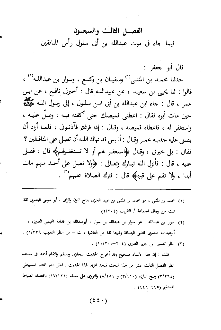 قلت: إن هذا الاسناد صحيح وقد أخرج الحديث البخارى ومسلم والإمام أحمد فى مسنده انظر الفصل الثالث عشر من هذا البحث فتجد تخريجا لهذا الحديث. انظر الدر المنثور للسيوطى (264/ 3) وفتح البارى (110/ 3) و (251/ 8) والنووى على مسلم (121/ 17) واقتضاء الصراط المستقيم (445 - 446).