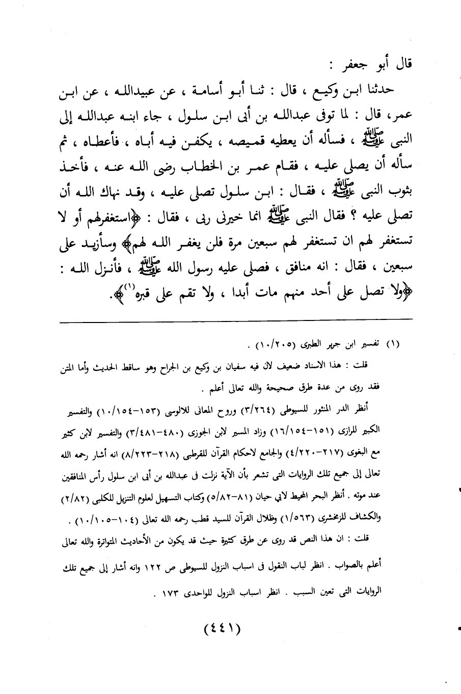 حدثنا ابن وكيع، قال: ثنا أبو أسامة، عن عبيد اللَّه، عن ابن عمر، قال: لما توفى عبد اللَّه بن أبى ابن سلول، جاء ابنه عبد اللَّه إلى النبي -صلى اللَّه عليه وسلم-، فسأله أن يعطه قميصه، يكفن فيه أباه، فأعطاه، ثم سأله أن يصلي عليه، فقام عمر بن الخطاب رضي اللَّه عنه، فأخذ بثوب النبي -صلى اللَّه عليه وسلم-، فقال: ابن سلول تصلى عليه، وقد نهاك اللَّه أن تصلى عليه؟ فقال النبي -صلى اللَّه عليه وسلم- إنما خيرني ربي، فقال: {اسْتَغْفِرْ لَهُمْ أَوْ لَا تَسْتَغْفِرْ لَهُمْ إِنْ تَسْتَغْفِرْ لَهُمْ سَبْعِينَ مَرَّةً فَلَنْ يَغْفِرَ اللَّهُ لَهُمْ} وسأزيد على سبعين، فقال: إنه منافق، فصلى عليه رسول اللَّه -صلى اللَّه عليه وسلم-، فأنزل اللَّه: {وَلَا تُصَلِّ عَلَى أَحَدٍ مِنْهُمْ مَاتَ أَبَدًا وَلَا تَقُمْ عَلَى قَبْرِهِ} (¬1).
