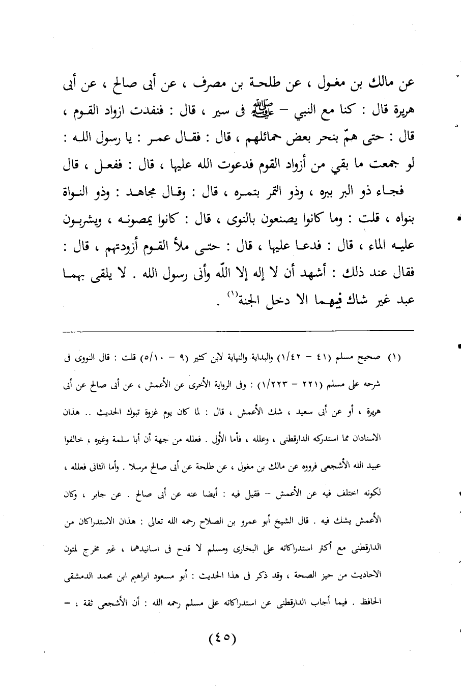 (¬1) صحيح مسلم (41 - 42/ 1) والبداية والنهاية لابن كثير (9 - 10/ 5) قلت: قال النووى فى شرحه على مسلم (221 - 223/ 1): وفى الرواية الأخرى عن الأعمش، عن أبى صالح عن أبى هريرة، أو عن أبى سعيد، شك الأعمش، قال: لما كان يوم غزوة تبوك الحديث .. هذان الاسنادان مما استدركه الدارقطنى، وعلله، فأما الأول. فعلله من جهة أن أبا سلمة وغيره، خالفوا عبيد اللَّه الأشجعى فرووه عن مالك بن مغول، عن طلحة من أبى صالح مرسلا. وأما الثانى فعلله، لكونه اختلف فيه عن الأعمش -فقيل فيه: أيضا عنه عن أبى صالح. عن جابر، وكان الأعمش يشك فيه. قال الشيخ أبو عمرو بن الصلاح رحمه اللَّه تعالى: هذان الاستدراكان من الدارقطنى مع أكثر استدراكاته على البخارى ومسلم لا قدح فى اسانيدهما، غير مخرج لمتون الاحاديث من حيز الصحة، وقد ذكر فى هذا الحديث: أبو مسعود ابراهيم ابن محمد الدمشقى الحافظ. فيما أجاب الدارقطنى عن استدراكاته على مسلم رحمه اللَّه: أن الأشجعى ثقة، =