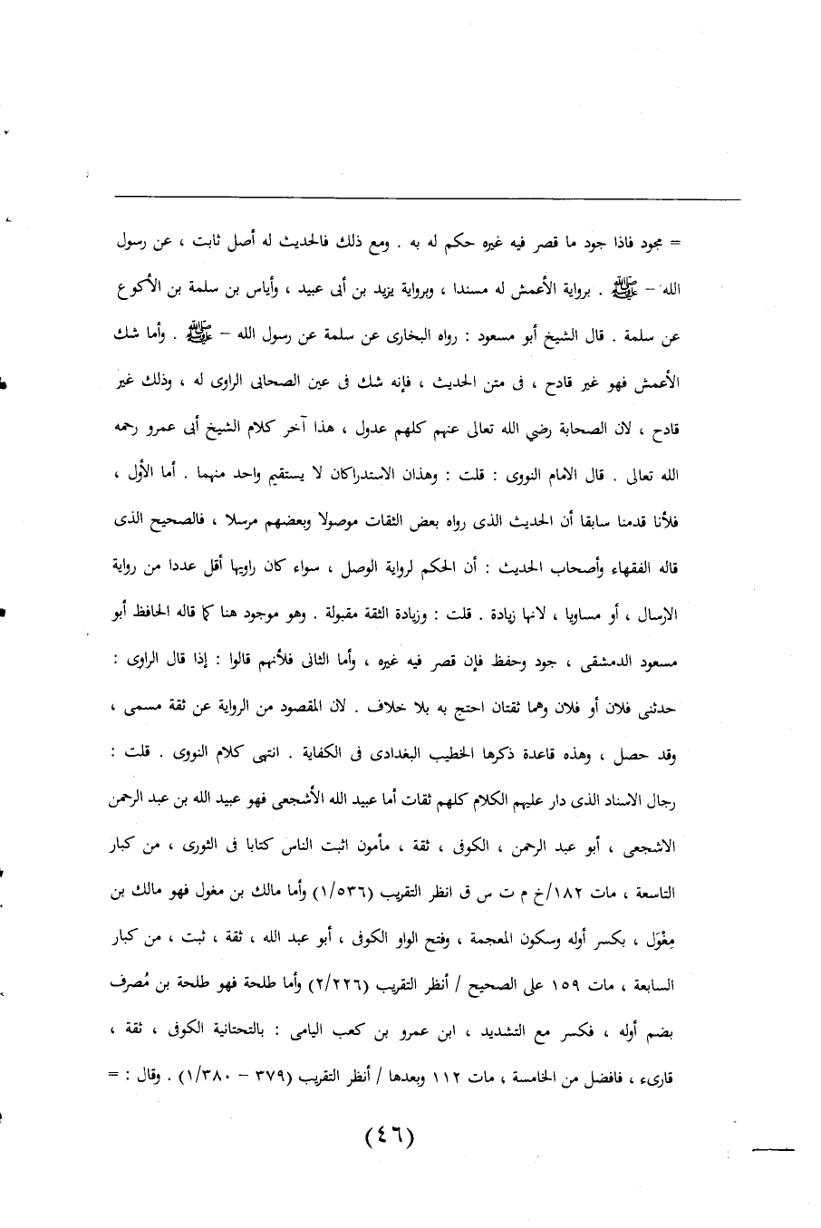 = مجود فإذا جود ما قصر فيه غيره حكم له به. ومع ذلك فالحديث له أصل ثابت، عن رسول اللَّه -صلى اللَّه عليه وسلم-. برواية الأعمش له مسندا، وبرواية يزيد بن أبى عبيد، وأياس بن سلمة بن الأكوع عن سلمة. قال الشيخ أبو مسعود: رواه البخارى عن سلمة عن رسول اللَّه -صلى اللَّه عليه وسلم-. وأما شك الأعمش فهو غير قادح، فى متن الحديث، فإنه شك فى عين الصحابى الراوى له، وذلك غير قادح، لان الصحابة رضي اللَّه تعالى عنهم كلهم عدول، هذا آخر كلام الشيخ أبى عمرو رحمه اللَّه تعالى. قال الامام النووى: قلت: وهذان الاستدراكان لا يستقيم واحد مهما. أما الأول، فلأنا قدمنا سابقا أن الحديث الذى رواه بعض الثقات موصولا وبعضهم مرسلا، فالصحيح الذى قاله الفقهاء وأصحاب الحديث: أن الحكم لرواية الوصل، سواء كان راويها أقل عددا من رواية الارسال، أو مساويا، لانها زيادة. قلت: وزيادة الثقة مقبولة. وهو موجود هنا كما قاله الحافظ أبو مسعود الدمشقى، جود وحفظ فإن قصر فيه غيره، وأما الثانى فلأنهم قالوا: إذا قال الراوى: حدثنى فلان أو فلان وهما ثقتان احتج به بلا خلاف. لان المقصود من الرواية عن ثقة مسمى، وقد حصل، وهذه قاعدة ذكرها الخطيب البغدادى فى الكفاية. انتهى كلام النووى. قلت: رجال الاسناد الذى دار عليهم الكلام كلهم ثقات أما عبيد اللَّه الأشجعى فهو عبيد اللَّه بن عبد الرحمن الاشجعى، أبو عبد الرحمن، الكوفى، ثقة، مأمون اثبت الناس كتابا فى الثورى، من كبار التاسعة، مات 182/ خ م ت س ق انظر التقريب (536/ 1) وأما مالك بن مغول فهو مالك بن مِغْوَل، بكسر أوله وسكون المعجمة، وفتح الواو الكوفى، أبو عبد اللَّه، ثقة، ثبت، من كبار السابعة، مات 159 على الصحيح/ انظر التقريب (226/ 2) وأما طلحة فهو طلحة بن مُصرف بضم أوله، فكسر مع التشديد، ابن عمرو بن كعب اليامى: بالتحتانية الكوفى، ثقة، قارئ، فافضل من الخامسة، مات 112 وبعدها/ انظر التقريب (379 - 380/ 1). وقال: =
